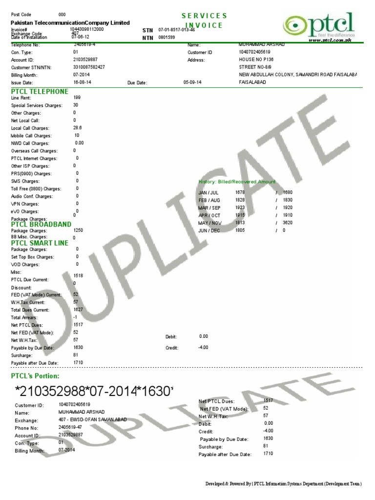 Pakistan PTCL Invoice Template in Word and PDF formats 2 page | Fake ...