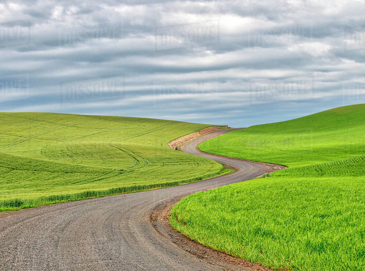 USA, Washington State, Palouse. Backcountry road leading through winter ...