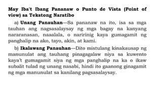 Unang Panauhan sa pananaw na ito isa sa mga tauhan ang nagsasalaysay ng ...