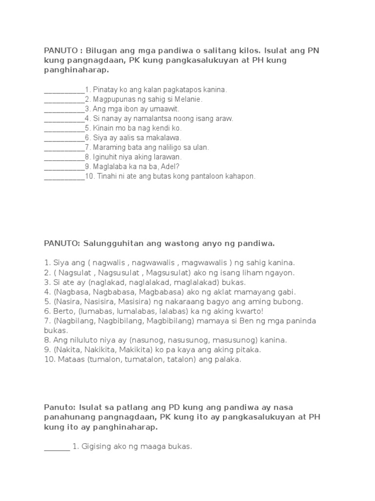 Worksheet on Pandiwa for Filipino 6: Activities and Exercises - Studocu