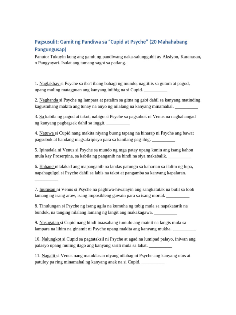Pagsusulit Gamit NG Pandiwa Cupid at Psyche 20 Mahahabang Pangungusap | PDF