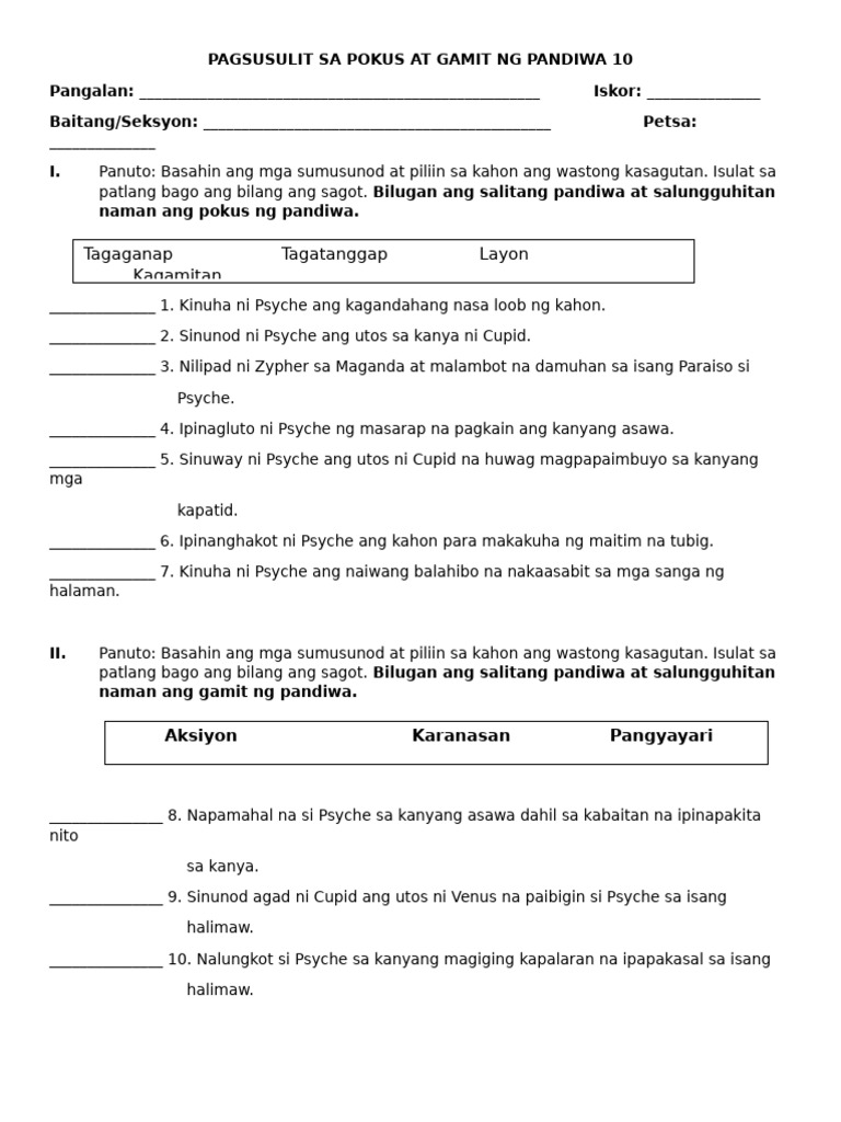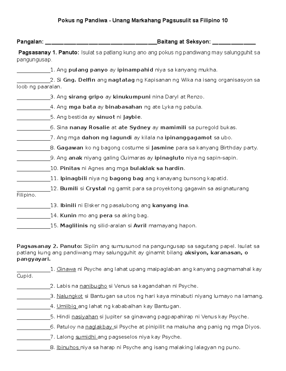 Mastery Test in Filipino 10: Pokus ng Pandiwa, Pagsusulit, | Course Hero