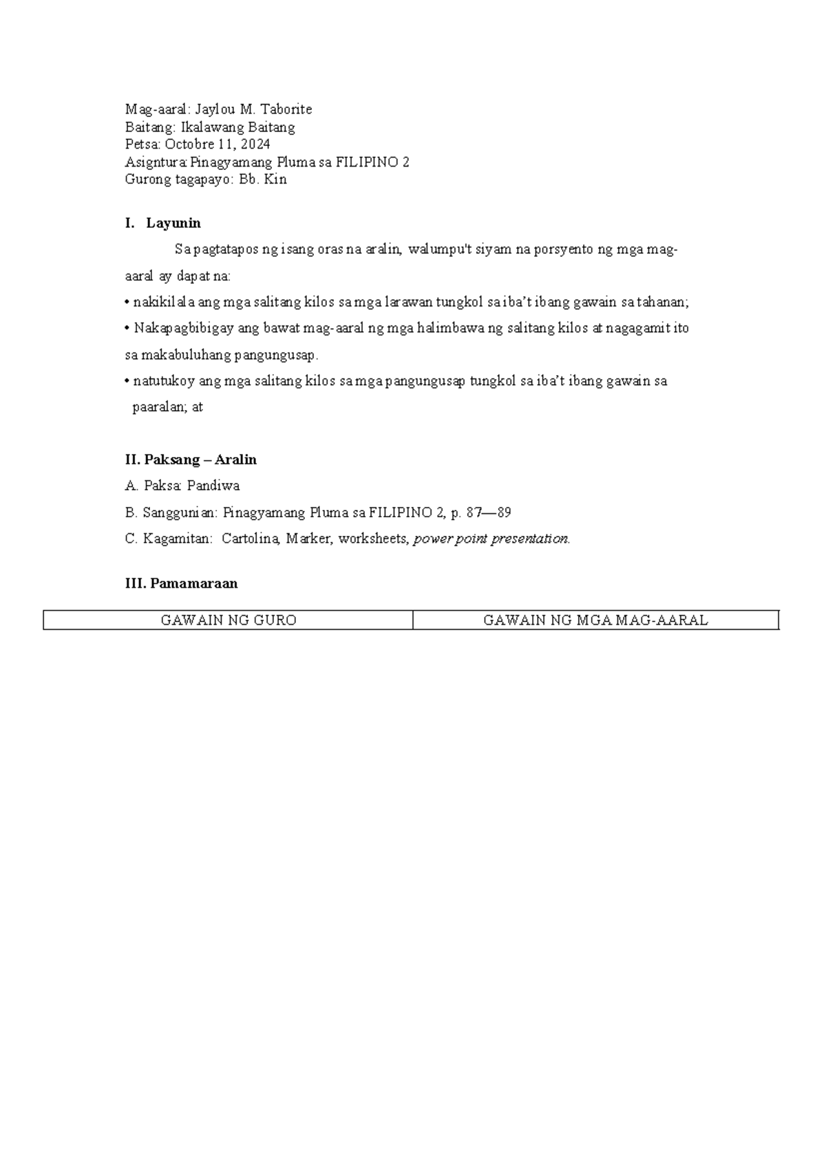 Lesson Plan Grade 1 Filipino Pandiwa - Free Printable Template
