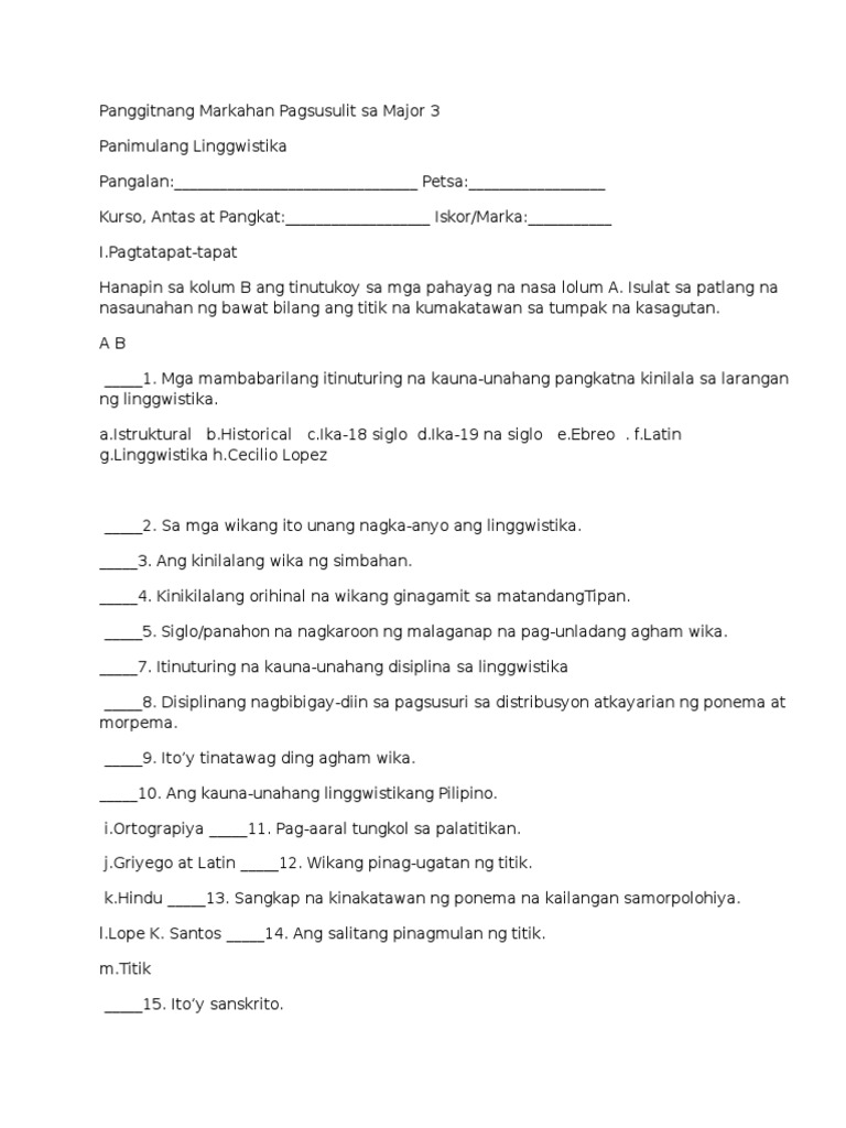 Panggitnang Markahan Pagsusulit Sa PANIMULANG LINGWISTIKA | PDF