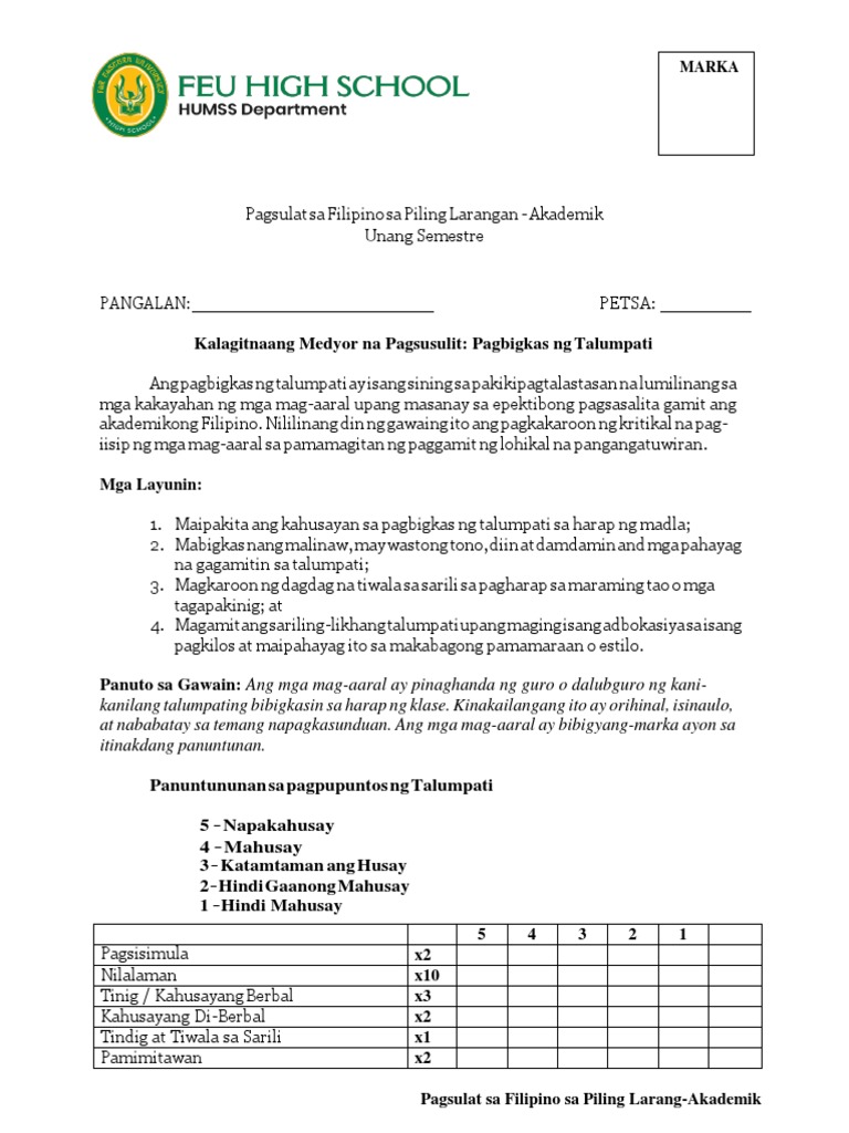 Panggitnang Pagsusulit Pormat Humss | PDF