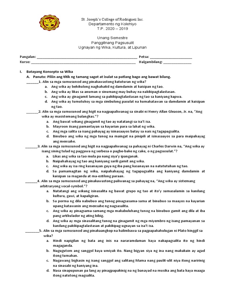 Panggitnang Pagsusulit- Filipino 1- Wika at Lipunan- Unang Semestre ...