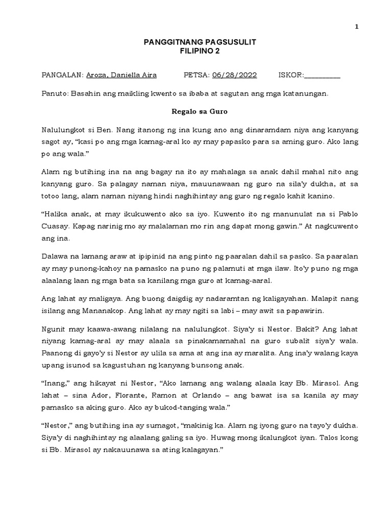 Panggitnang Pagsusulit Sa Maikling Kuwento at Nobelang Filipino | PDF