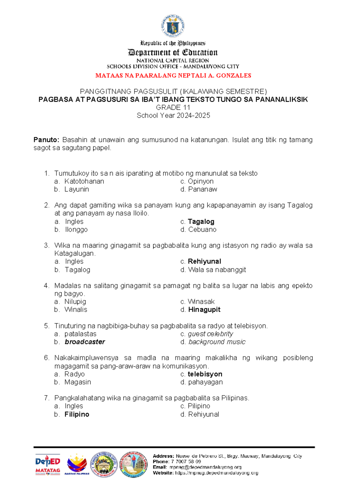 Pagbas- Panggitnang- Pagsusulit - MATAAS NA PAARALANG NEPTALI A ...