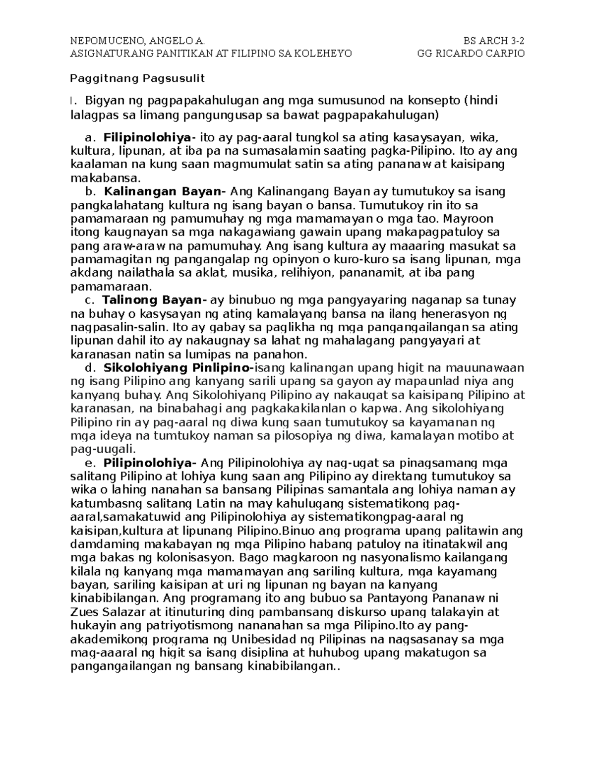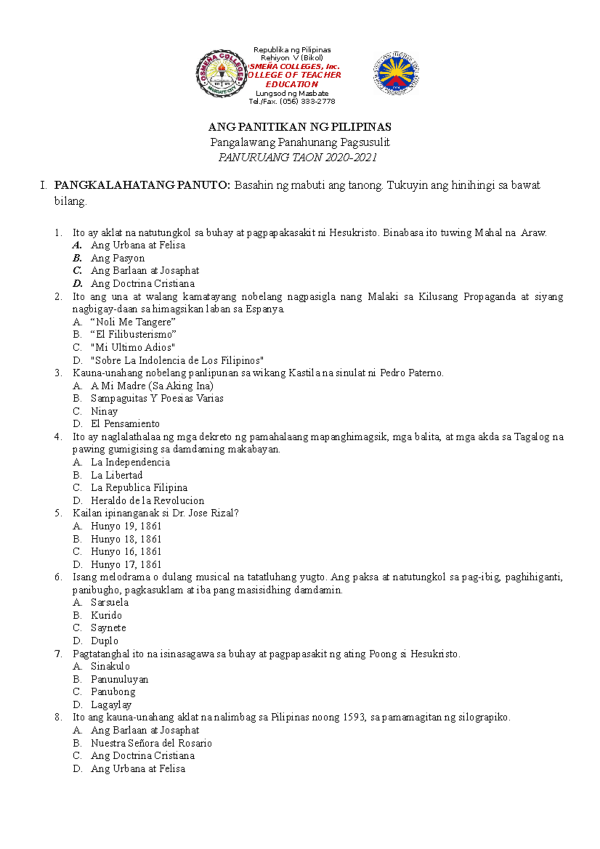 Nepomuceno Pagitnang Pagsusulit - ASIGNATURANG PANITIKAN AT FILIPINO SA ...