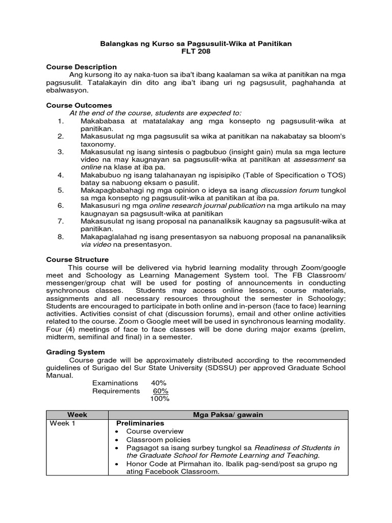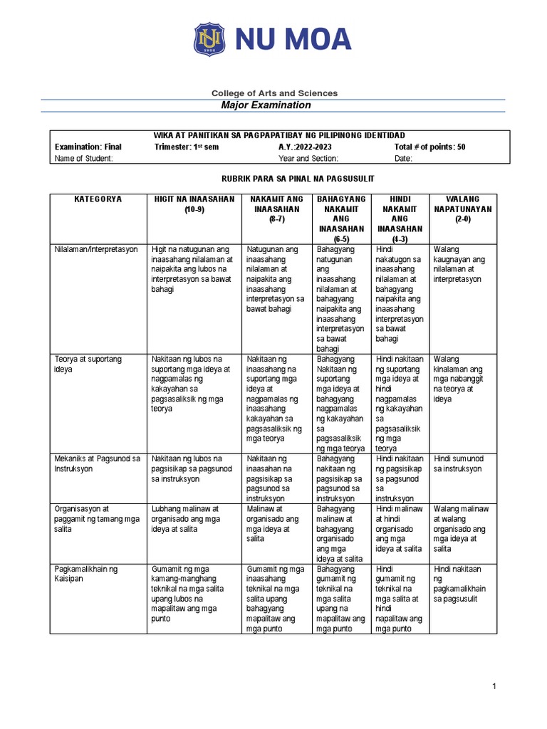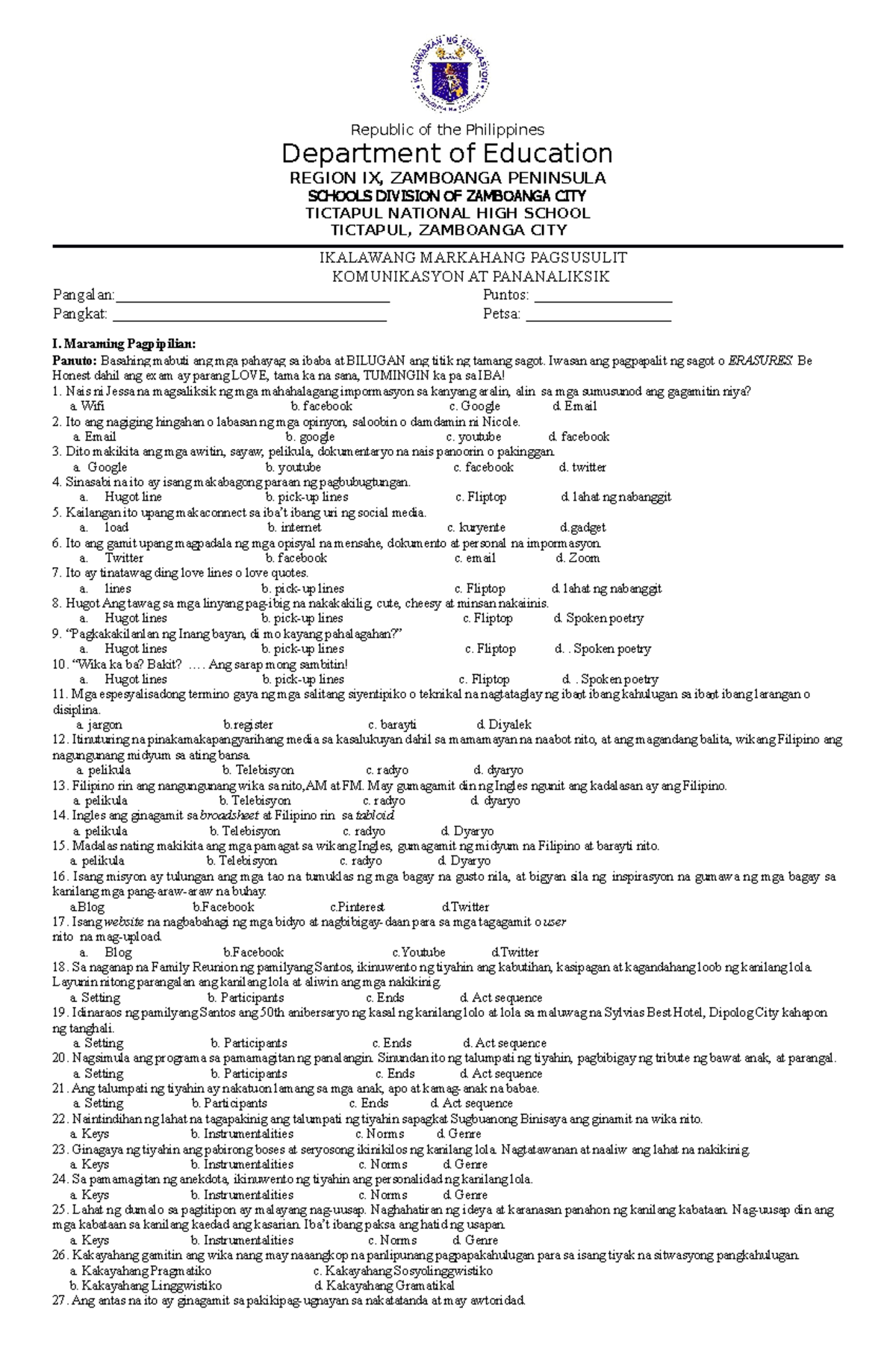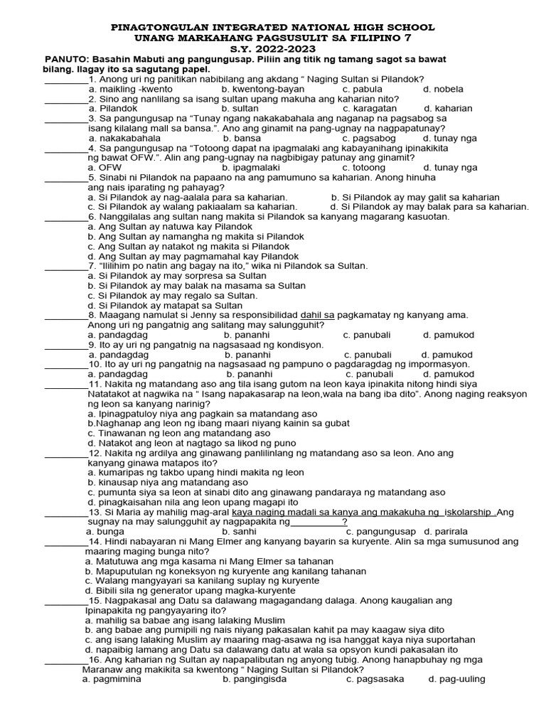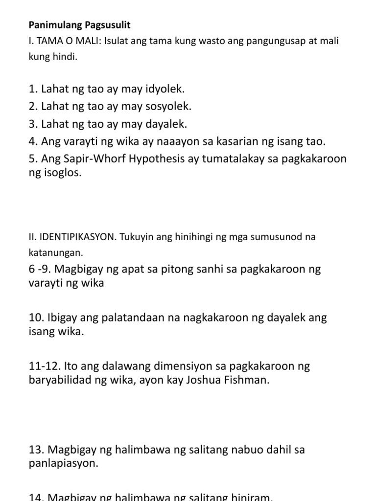 Halimbawang Pagsusulit Sa Filipino | PDF