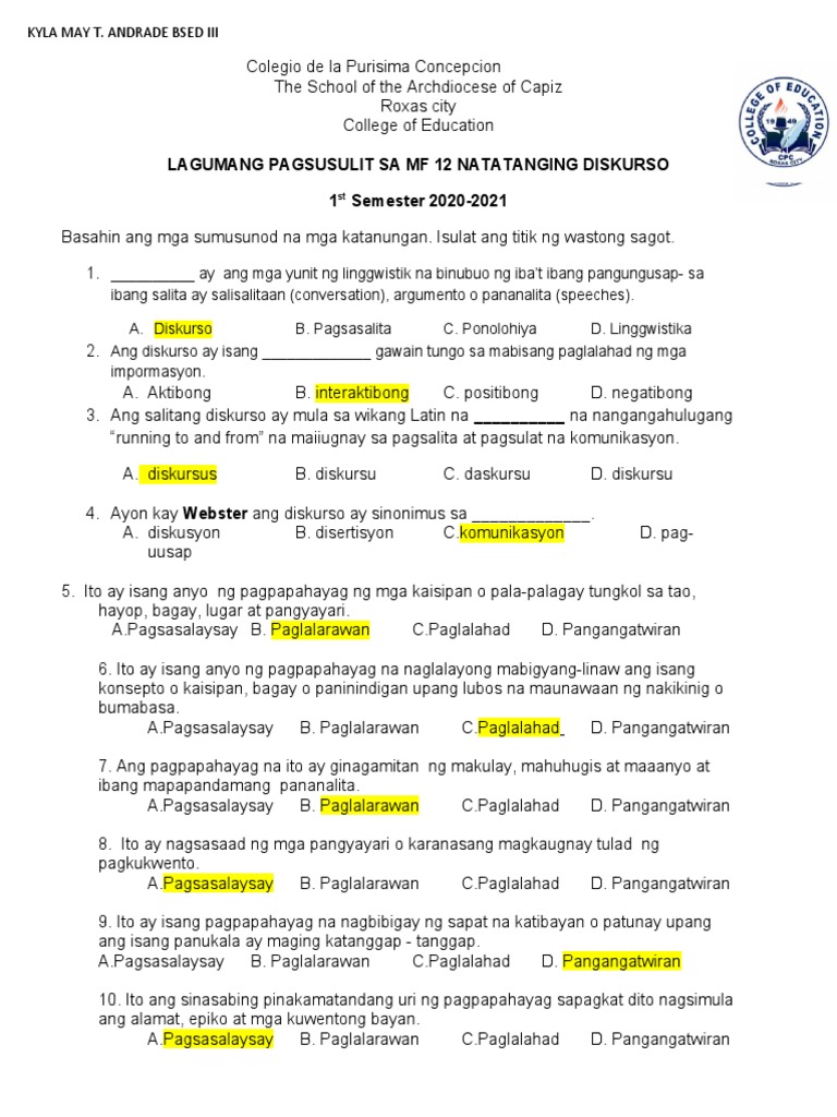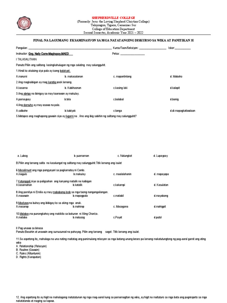 Final Lagumang Pagsusulit Sa Mga Tatanging Dskurso Sa Wikaat Panitikan ...