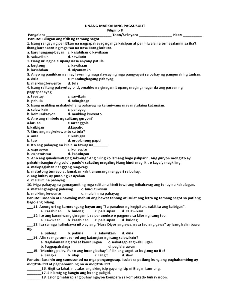 Unang Pagsusulit Sa Filipino 8 | PDF