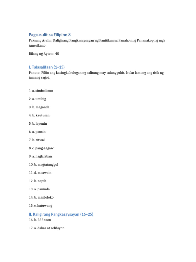 Filipino 8: Pagsusulit sa Panitikan at Talasalitaan | Course Hero