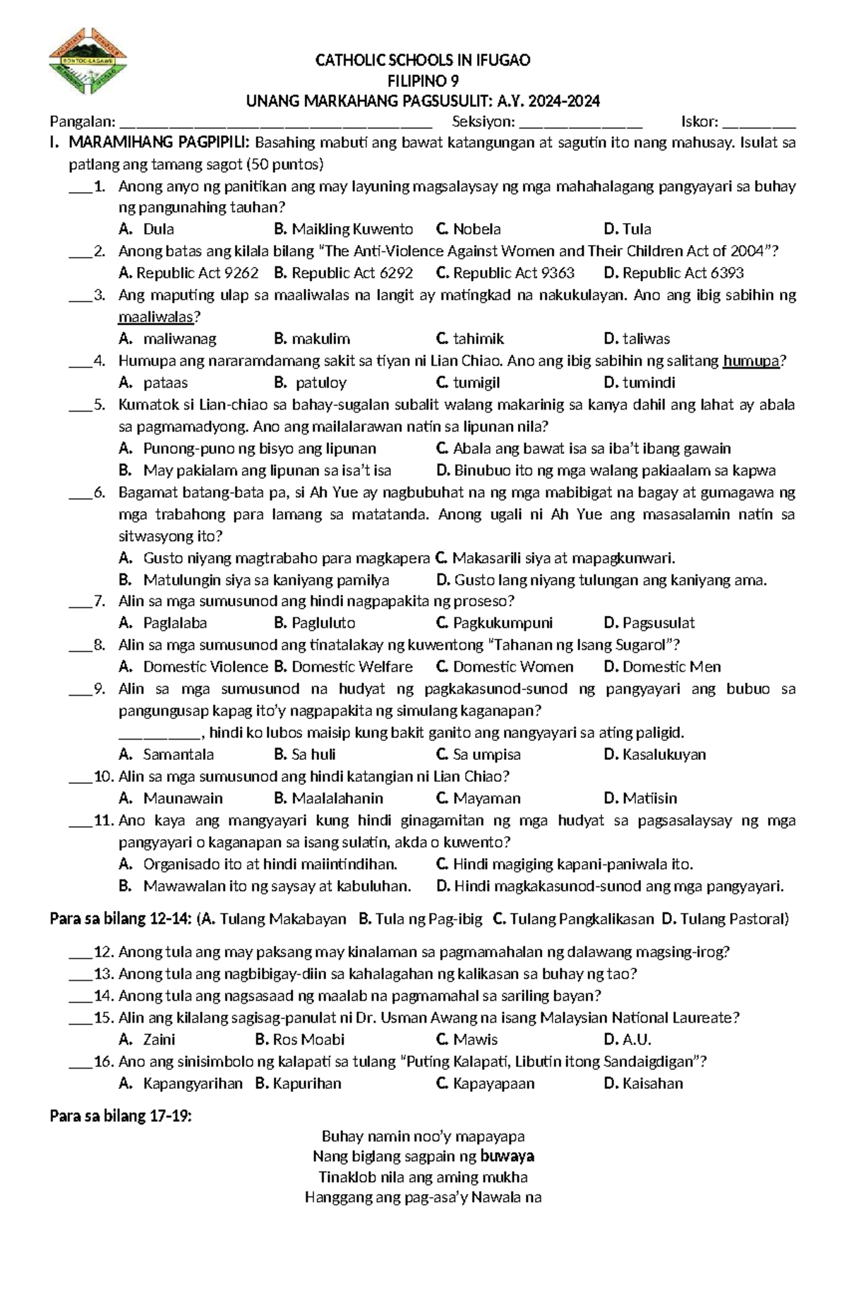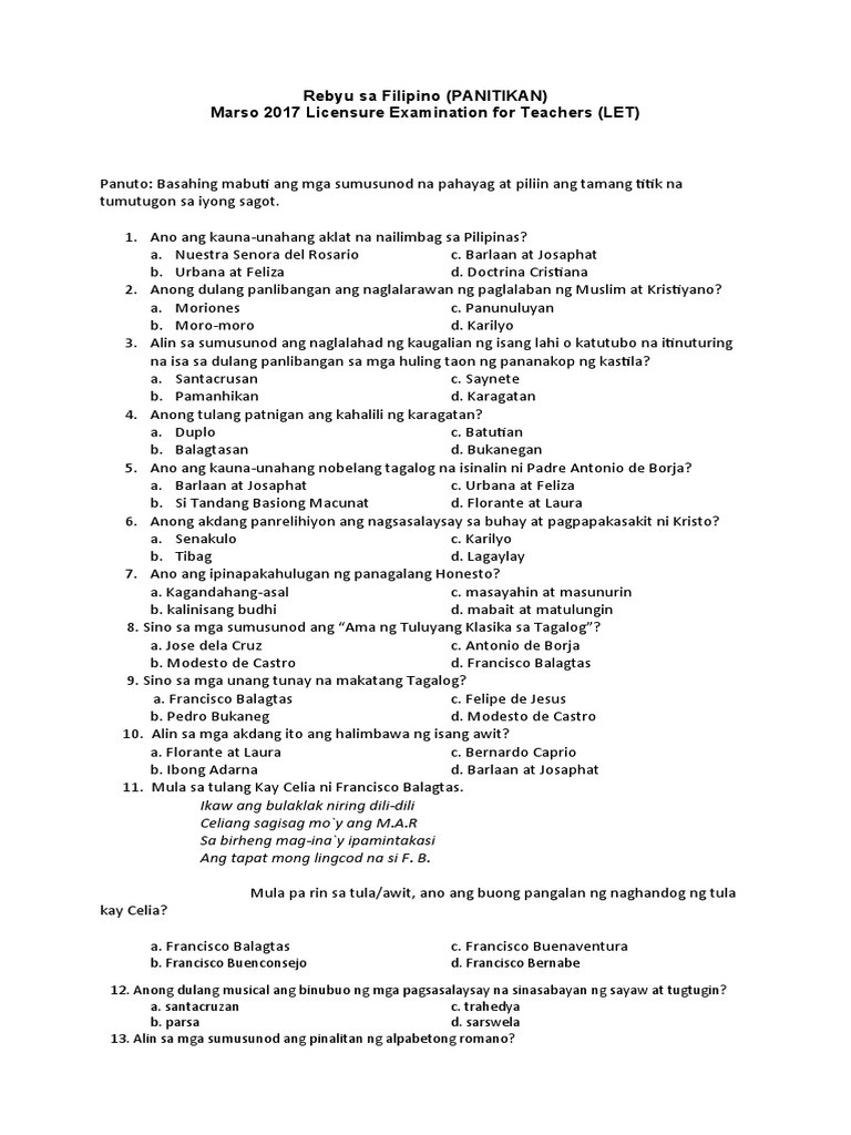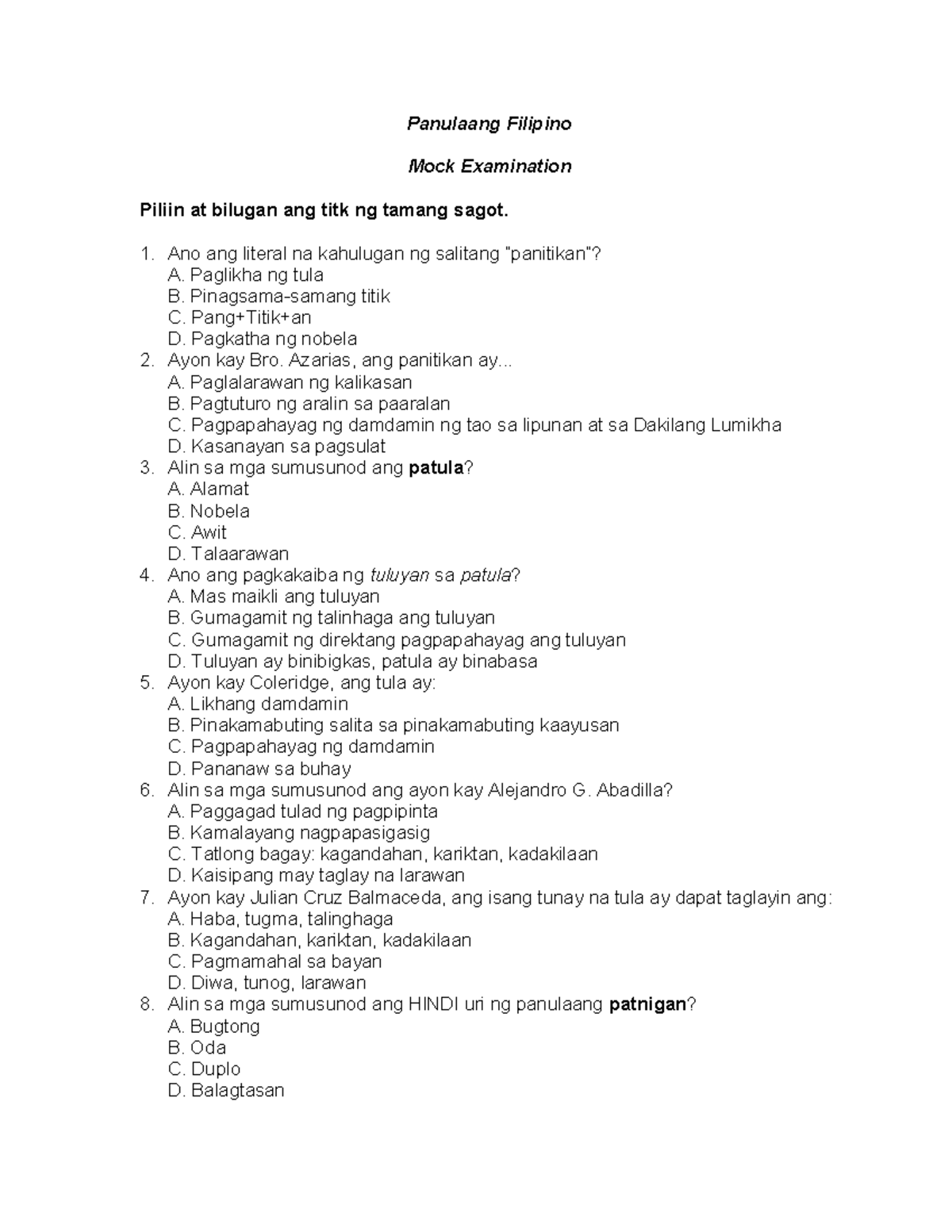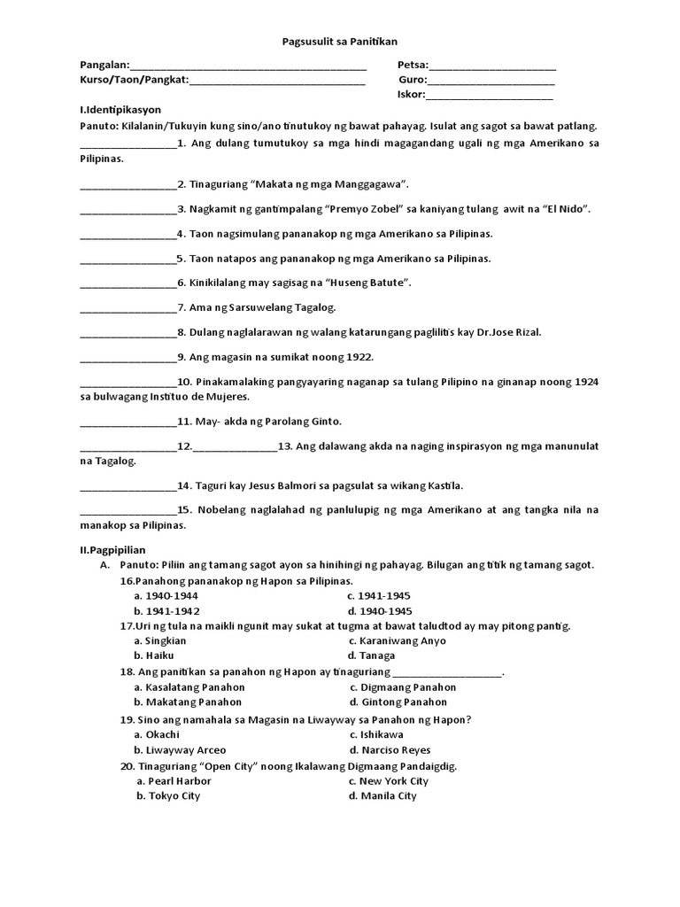 Panulaang Filipino Mock Exam: Pagsusulit sa Panitikan - Studocu