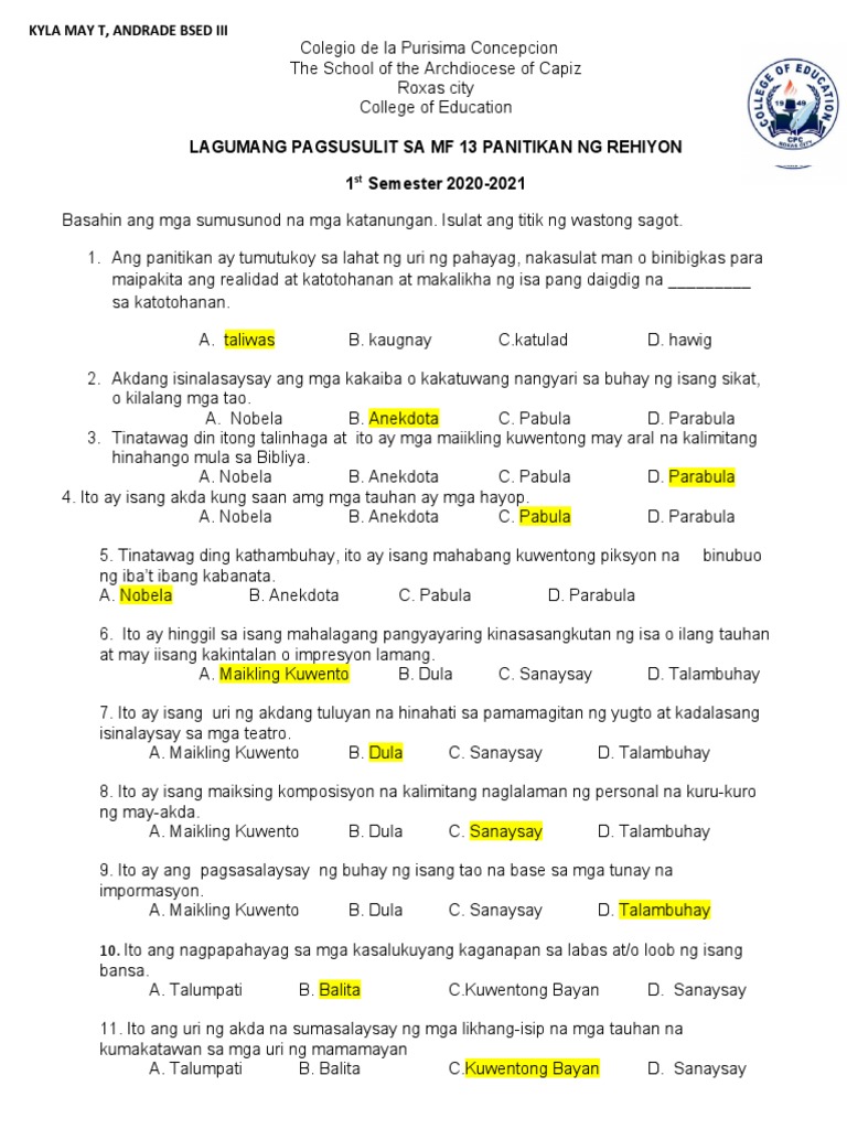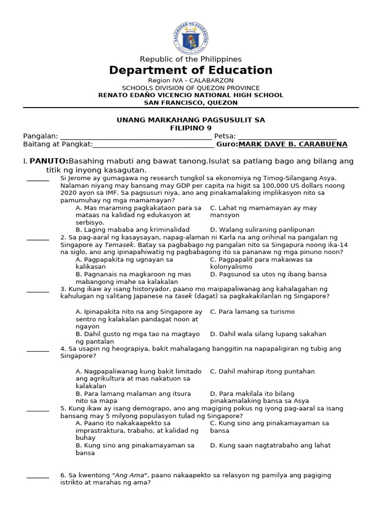 Halimbawa Ng Pagsusulit Sa Filipino 9 Mga Halimbawa Ng Pagsusulit Sa ...