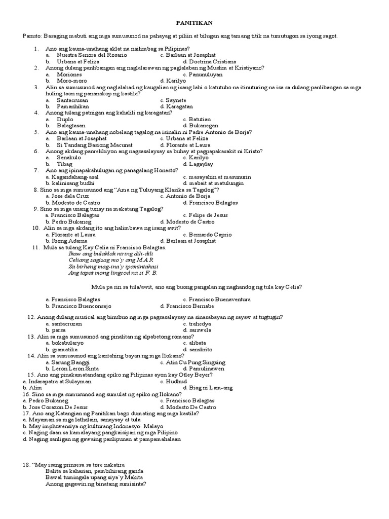 Pagsusulit sa Panitikang Pilipino (Katutubong Panitikan at Kastila ...