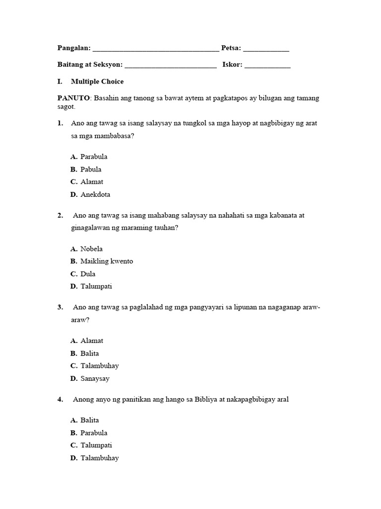 SOLUTION: Panitikan: Teoryang Pampanitikan Pagsusulit at mga Sagot ...