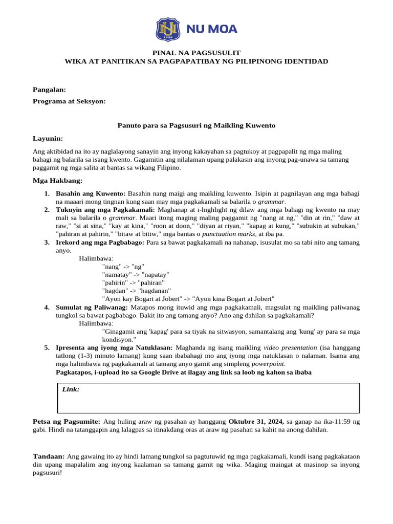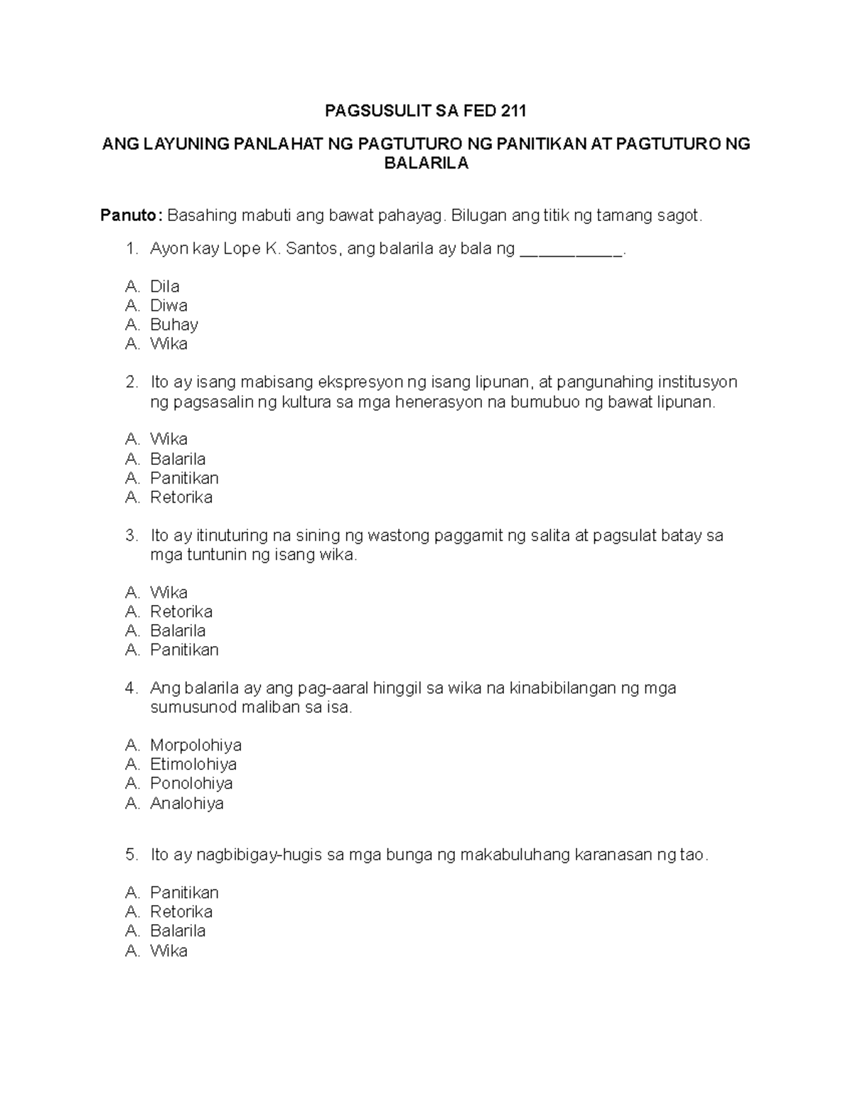 Maikling Pagsusulit sa FED 211: Kahalagahan ng Panitikan at Balarila ...