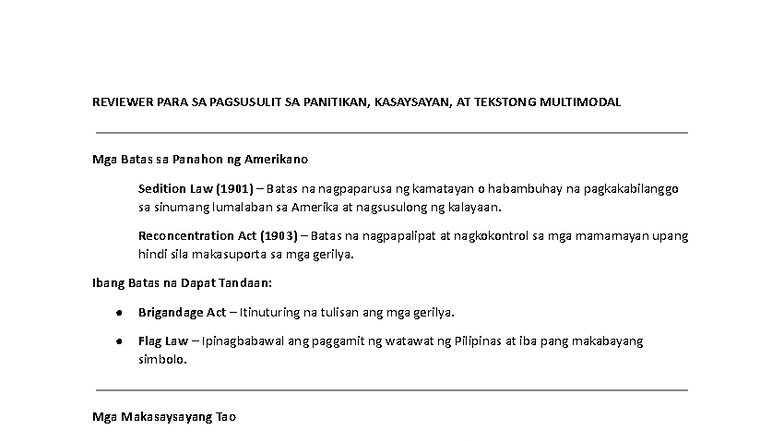 FIL8 Quarter 2 Reviewer: Pagsusulit sa Panitikan at Kasaysayan - Studocu