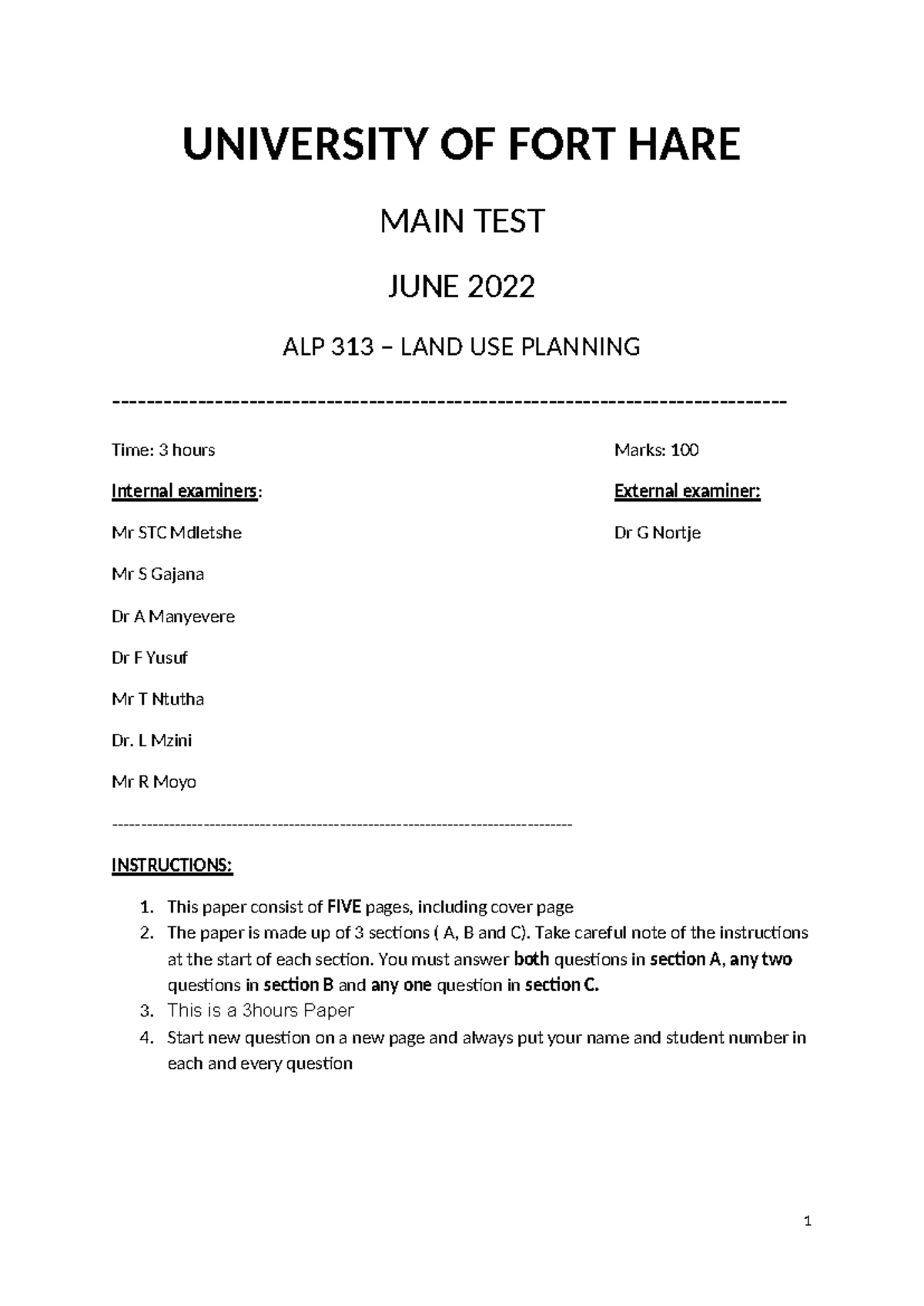 ALP 313 MAIN TEST JUNE 2022: LAND USE PLANNING Exam Paper - Studocu