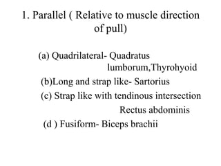 (A) Parallel muscle: Muscle fibers run parallel to the muscle's ...