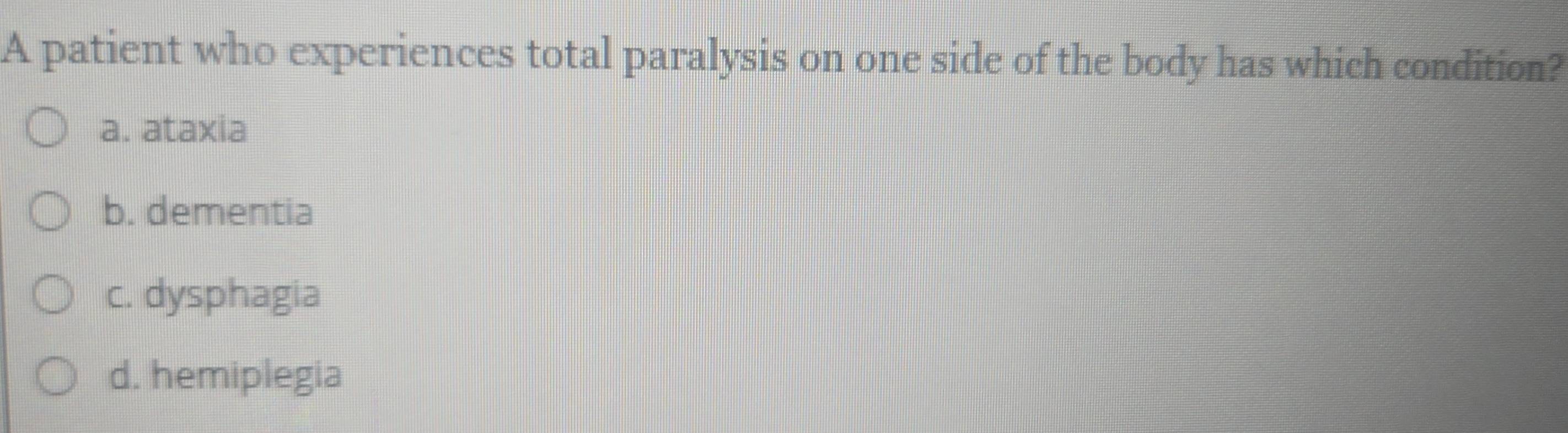 Solved: A patient who experiences total paralysis on one side of the ...