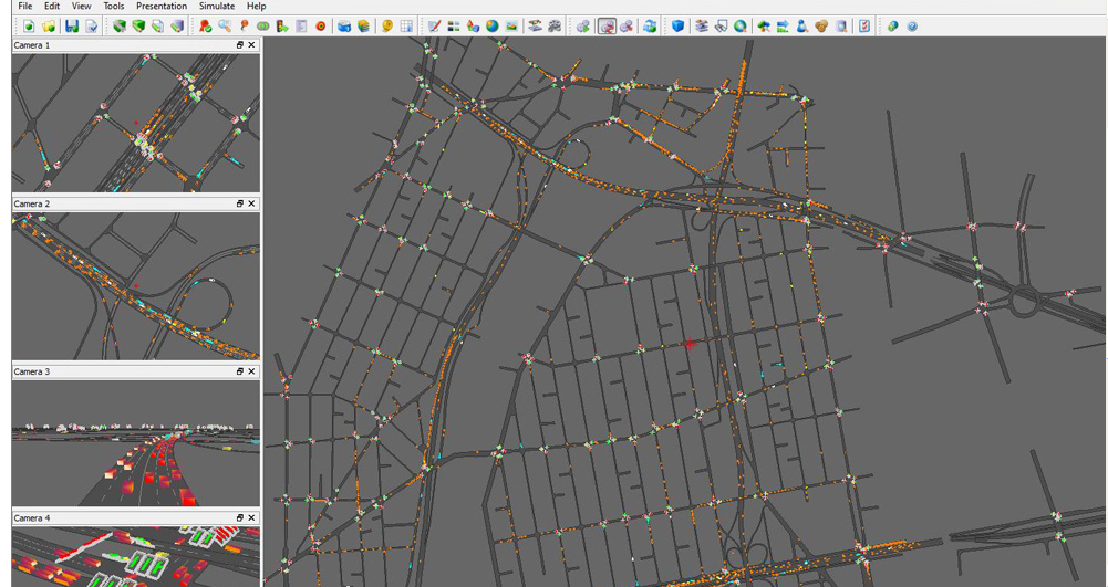 Paramics Modeller traffic simulation running, showing three dimensional ...