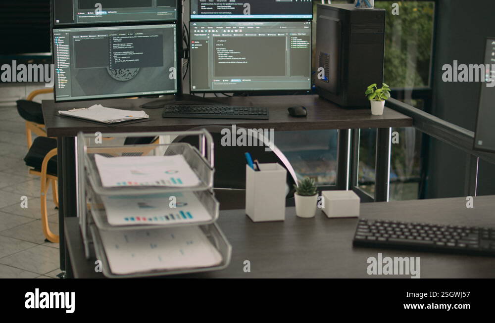 Computer monitors showing parsing code in empty it agency office Stock ...
