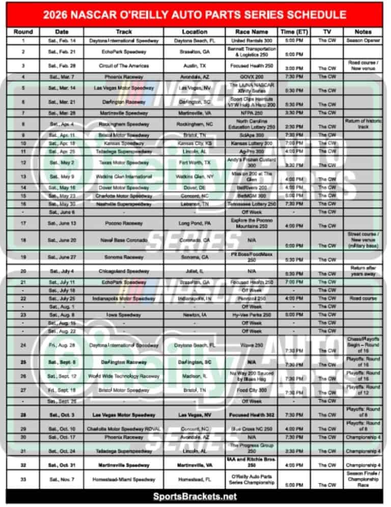 2026 NASCAR O’Reilly Auto Parts Series Schedule: Results, TV Channels ...