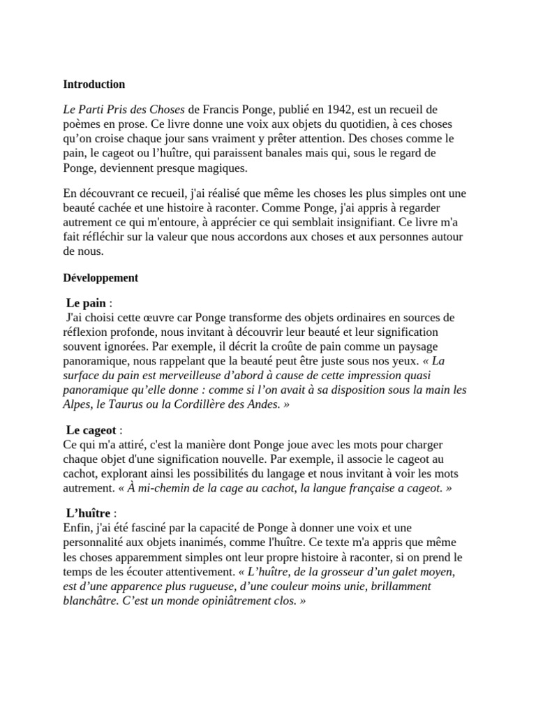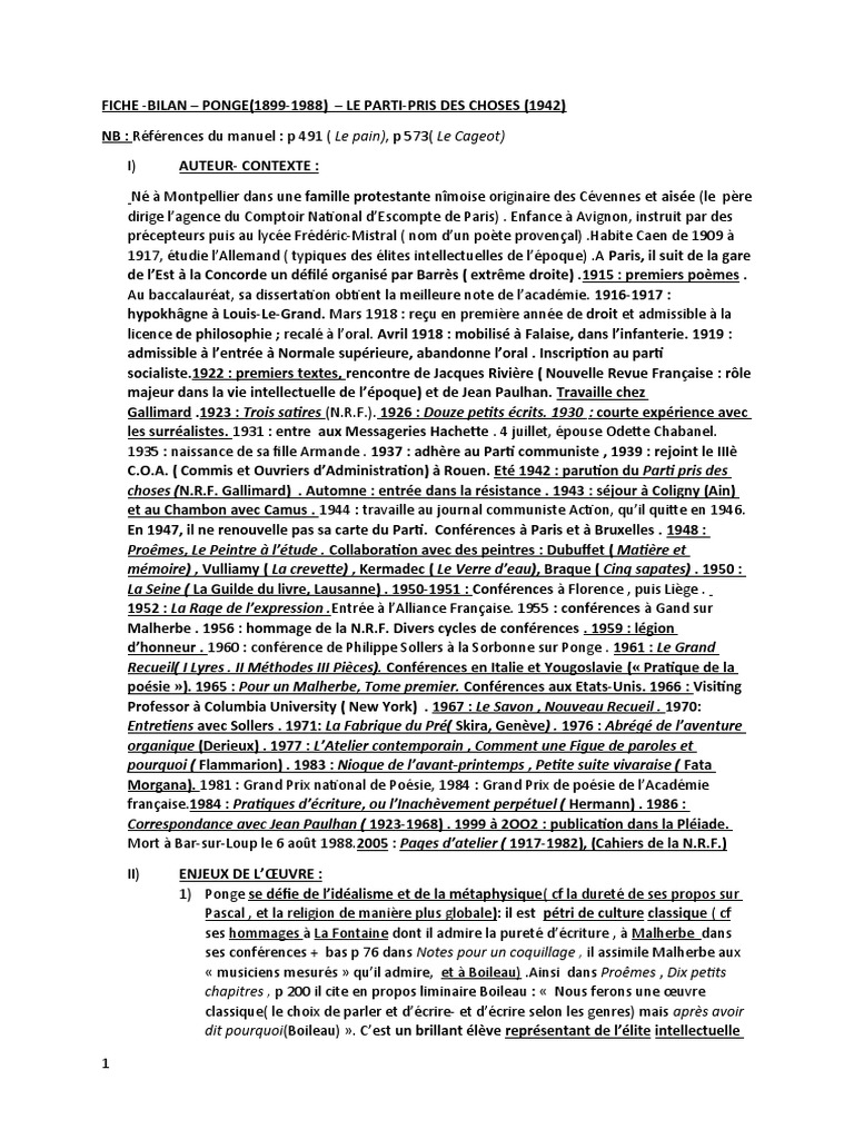 Fiche de lecture - Le Parti pris des choses de Francis Ponge (Fiche de ...