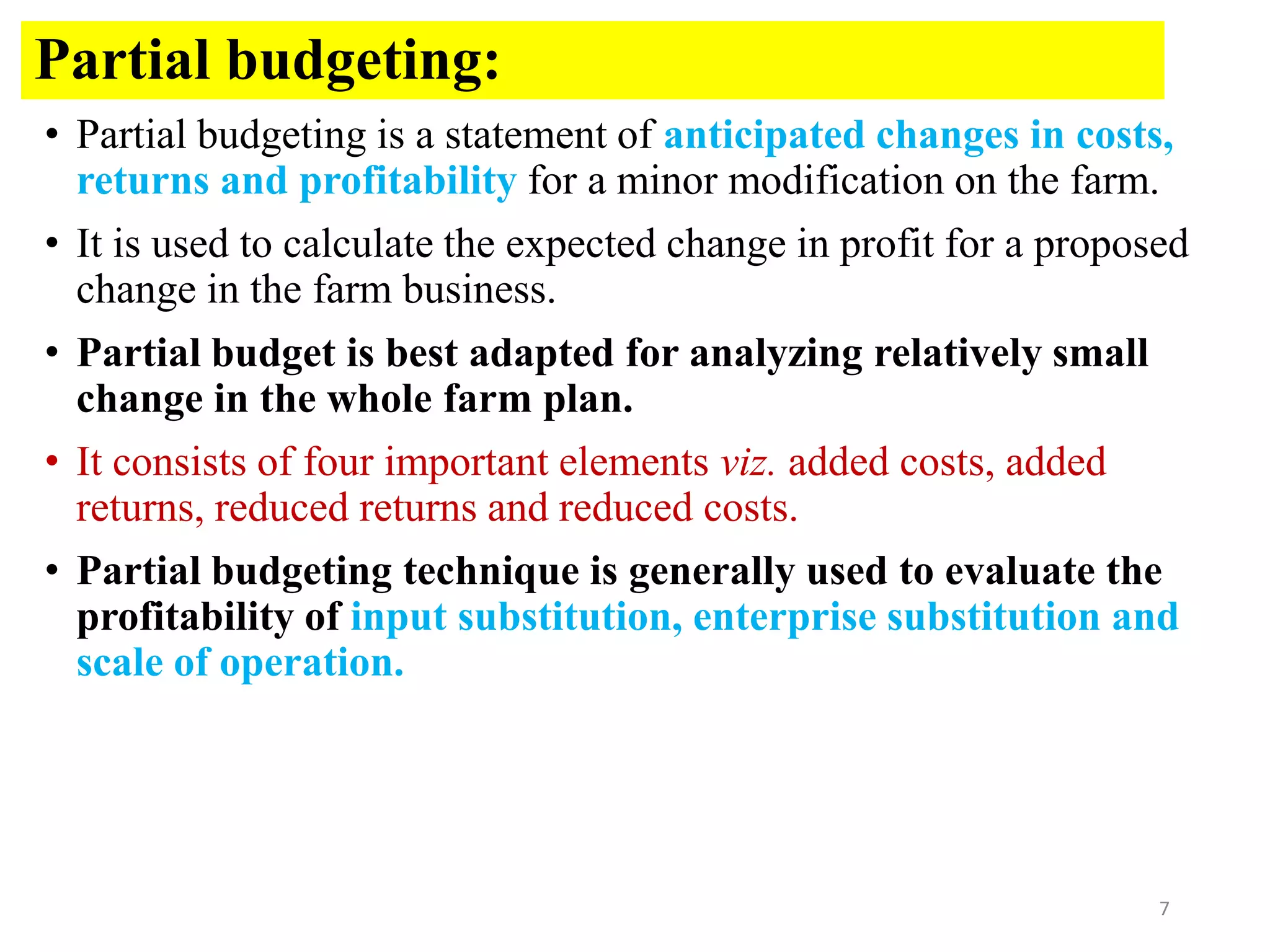 Farm budgeting- Enterprise partial budgeting and complete budget