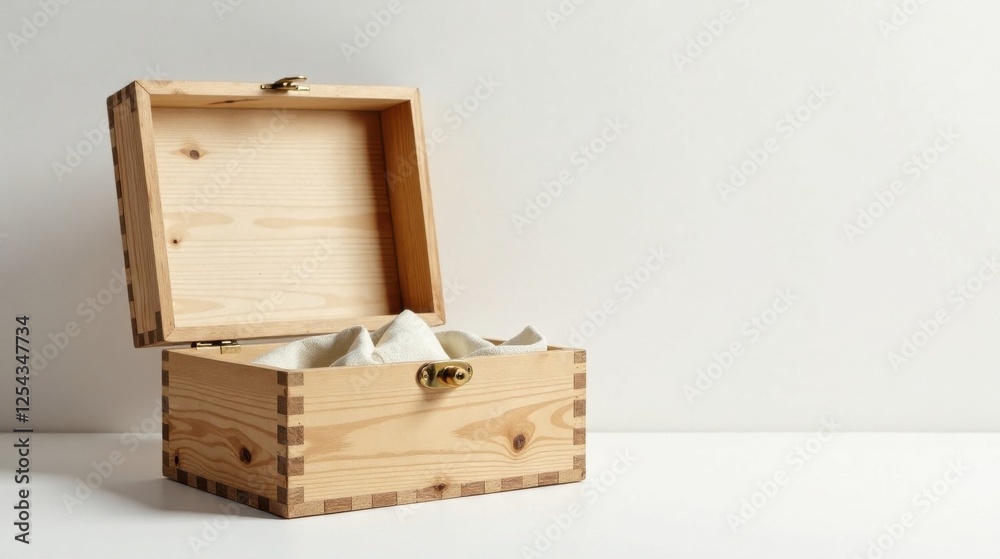 A simple wooden box with a latch, partially open, revealing a soft ...