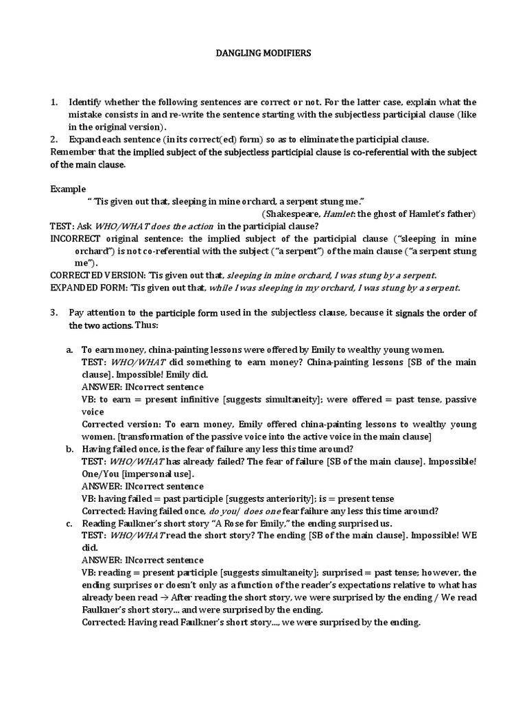 Participial Constructions (Dangling Modifiers) - Further Practice | PDF ...