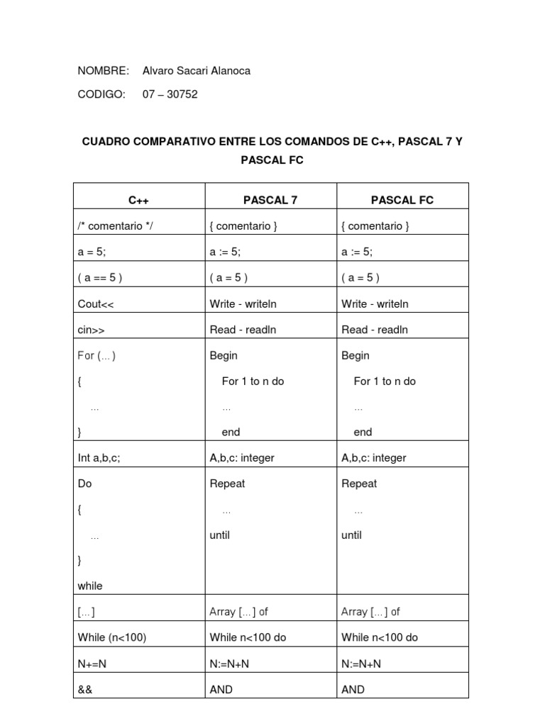 Comparison of C++, Pascal 7 and Pascal FC Command Syntax | PDF