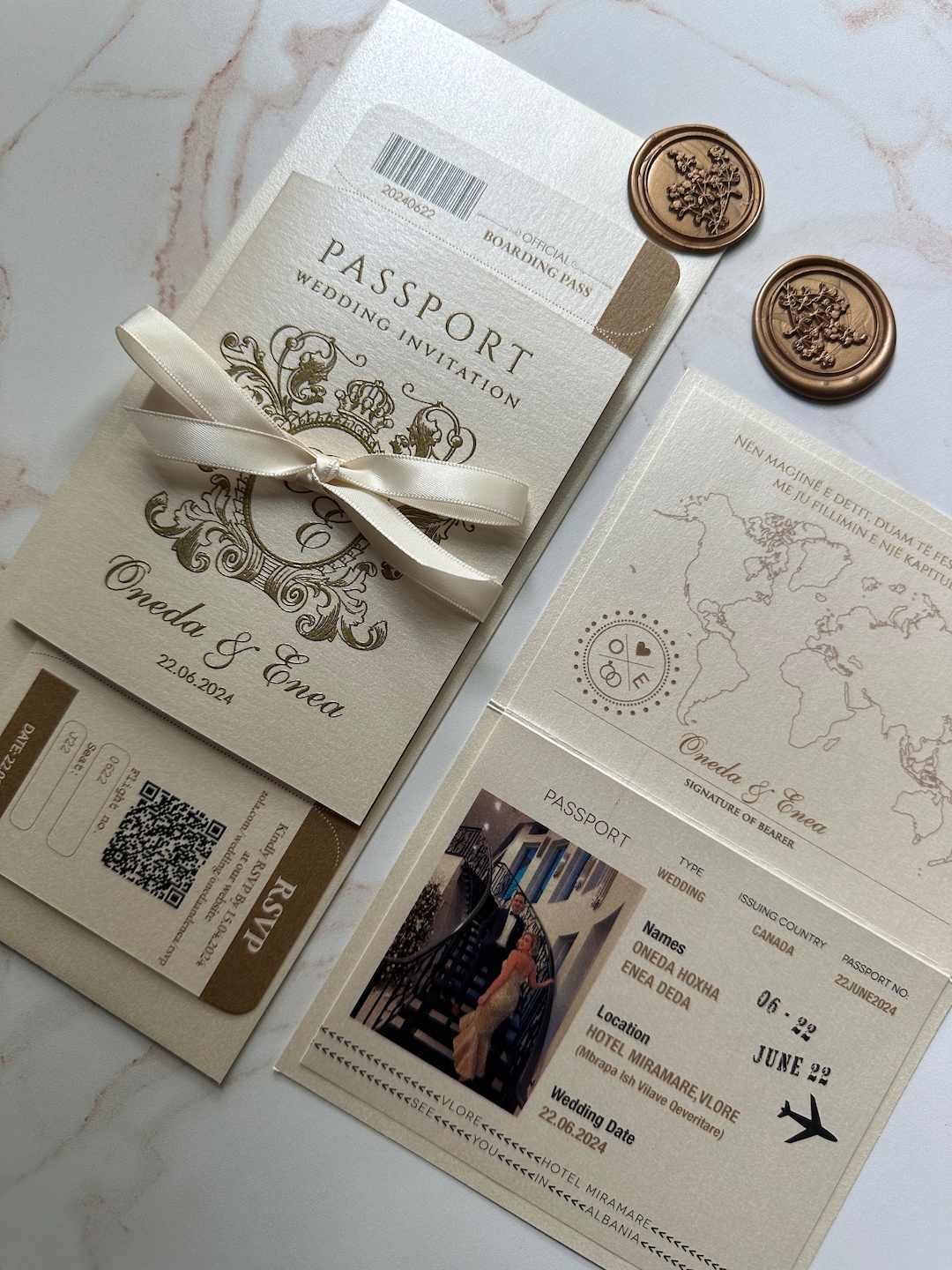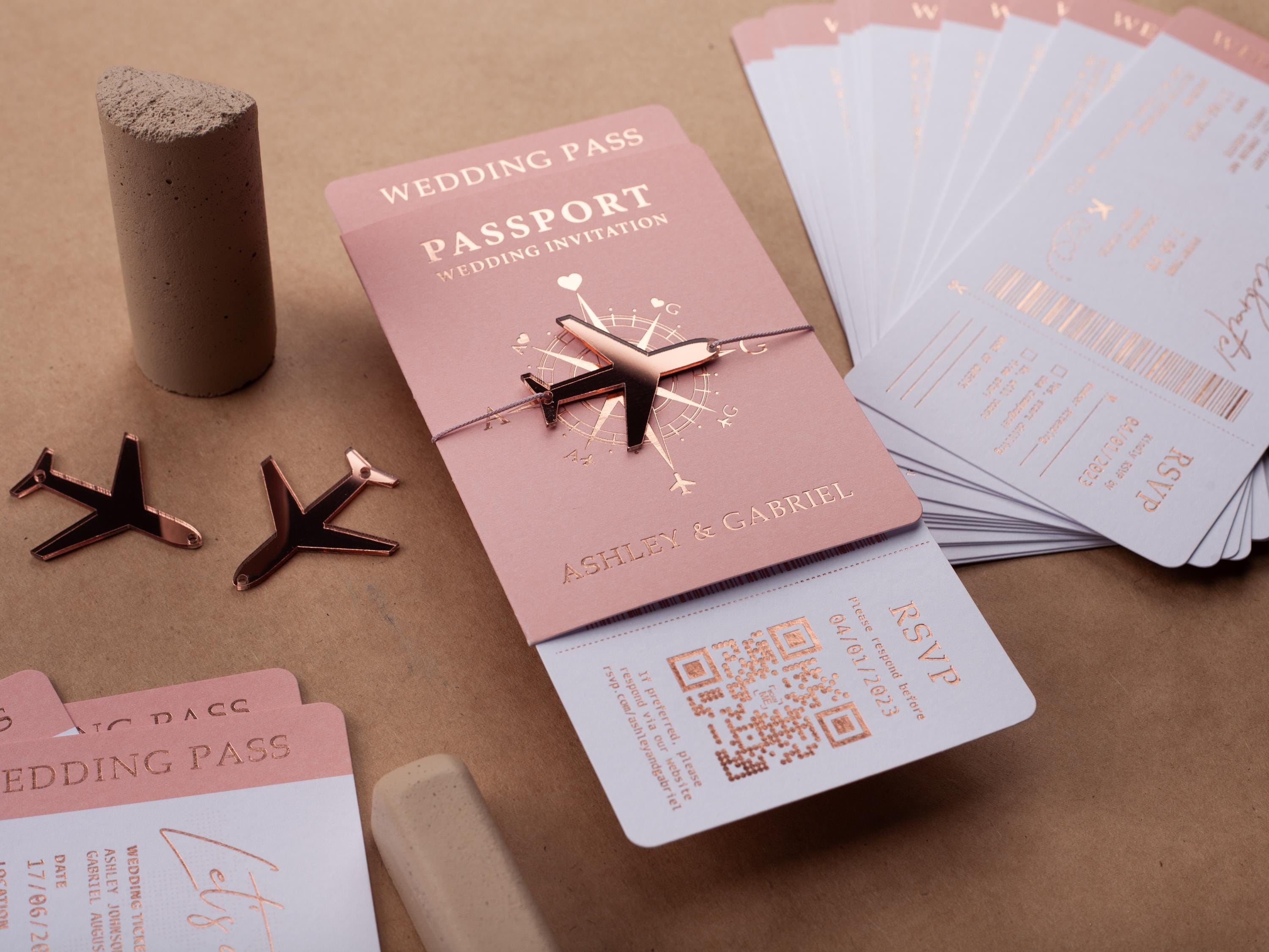 Passport wedding invitation with rose gold foil engraved plabe boarding ...