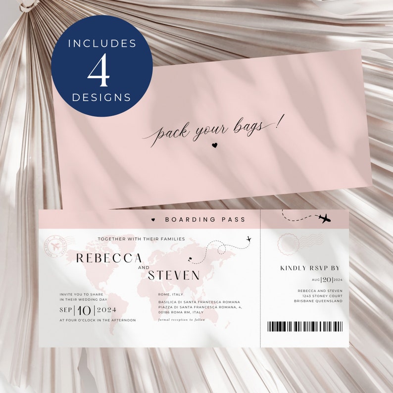 Passport Wedding Invitation, Boarding Pass Invite, Pink and Rose Gold ...