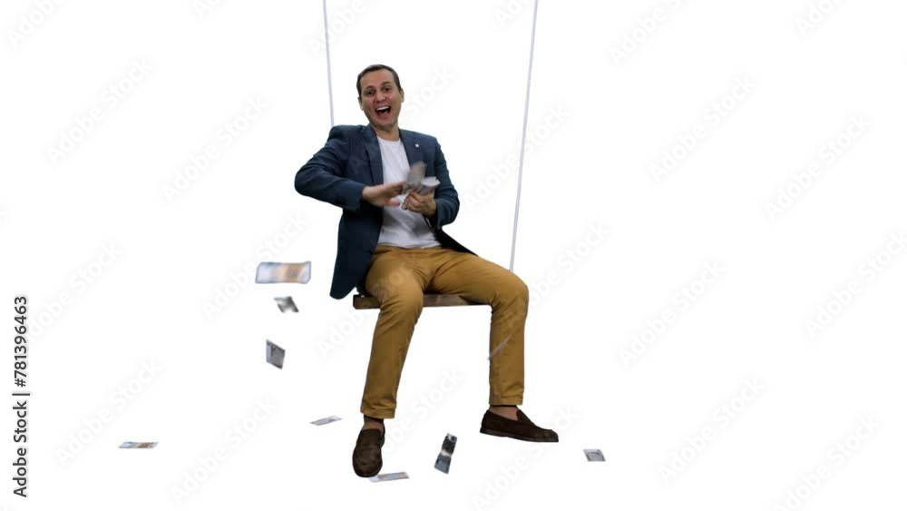 Happy businessman scattering euro cash banknotes sitting on rope swing ...