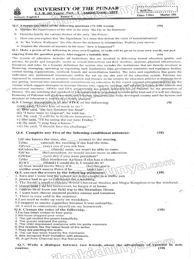 Past Paper LLB Part 1 For 5 year Program Punjab University English ...