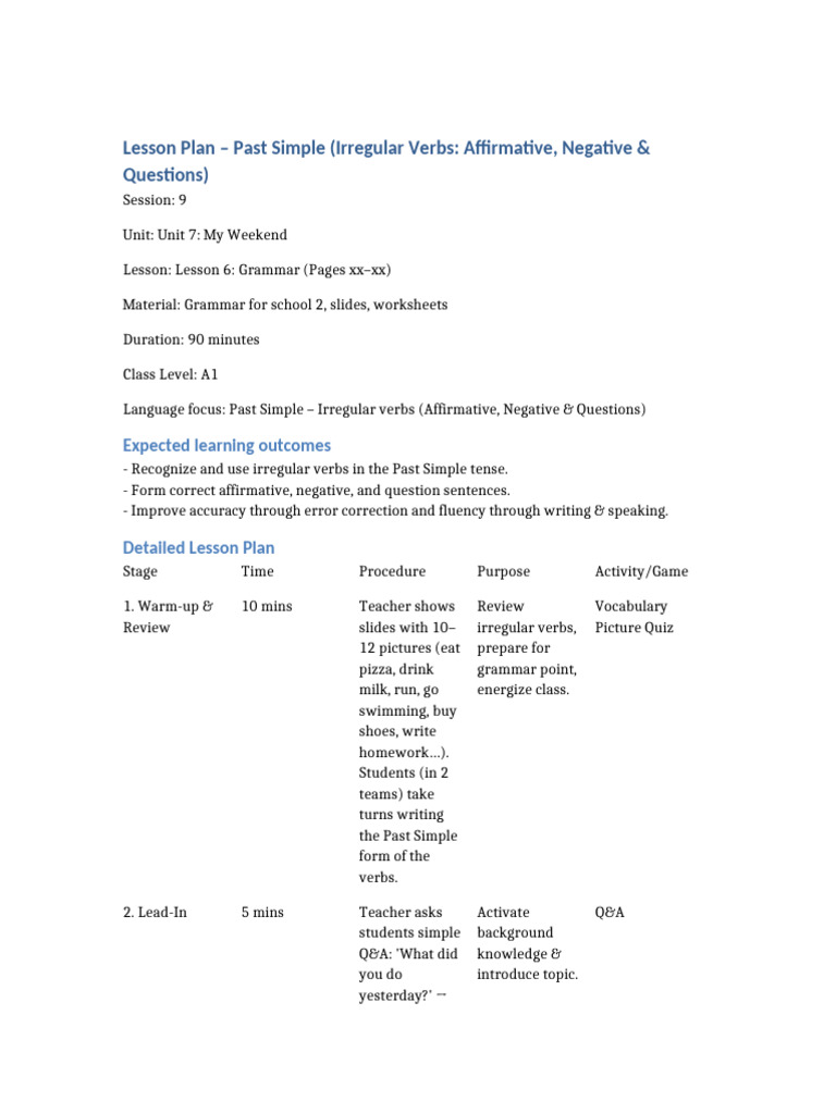 Lesson Plan Past Simple With Worksheet | PDF | Lesson Plan | Learning