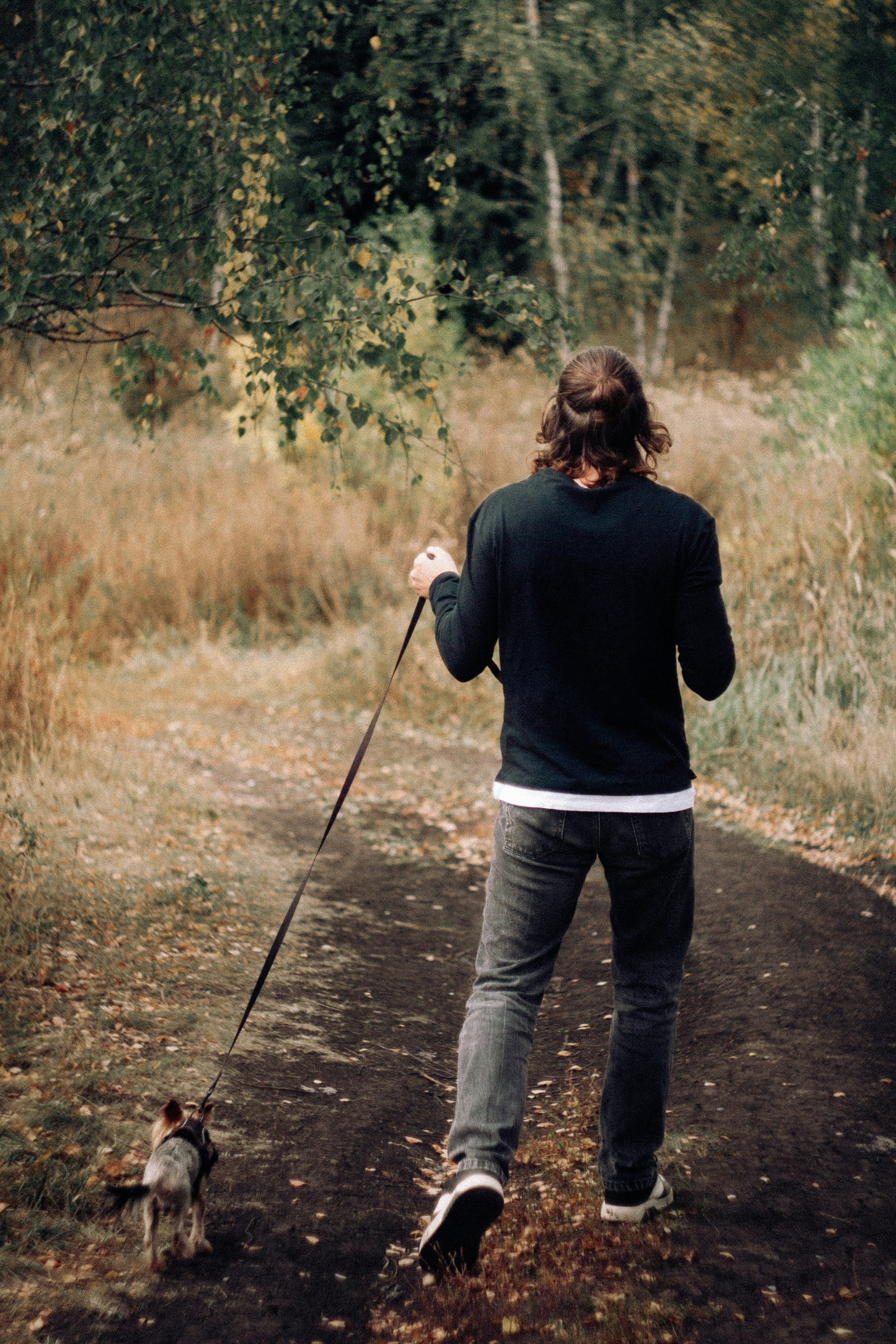 Man walking a small dog on a path photo – Free Autumn Image on Unsplash
