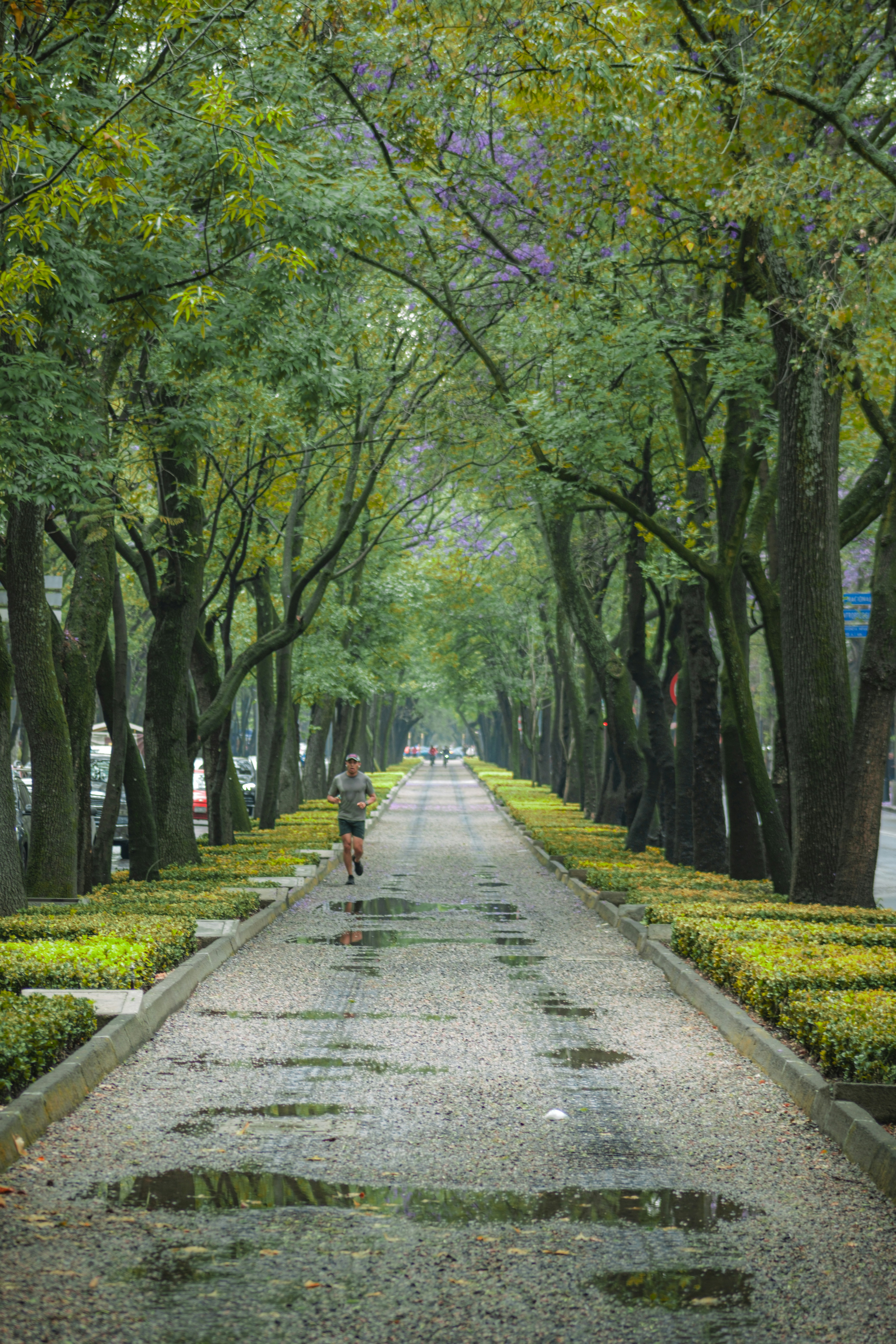 A person runs down a tree-lined path after rain. photo – Free Spring ...