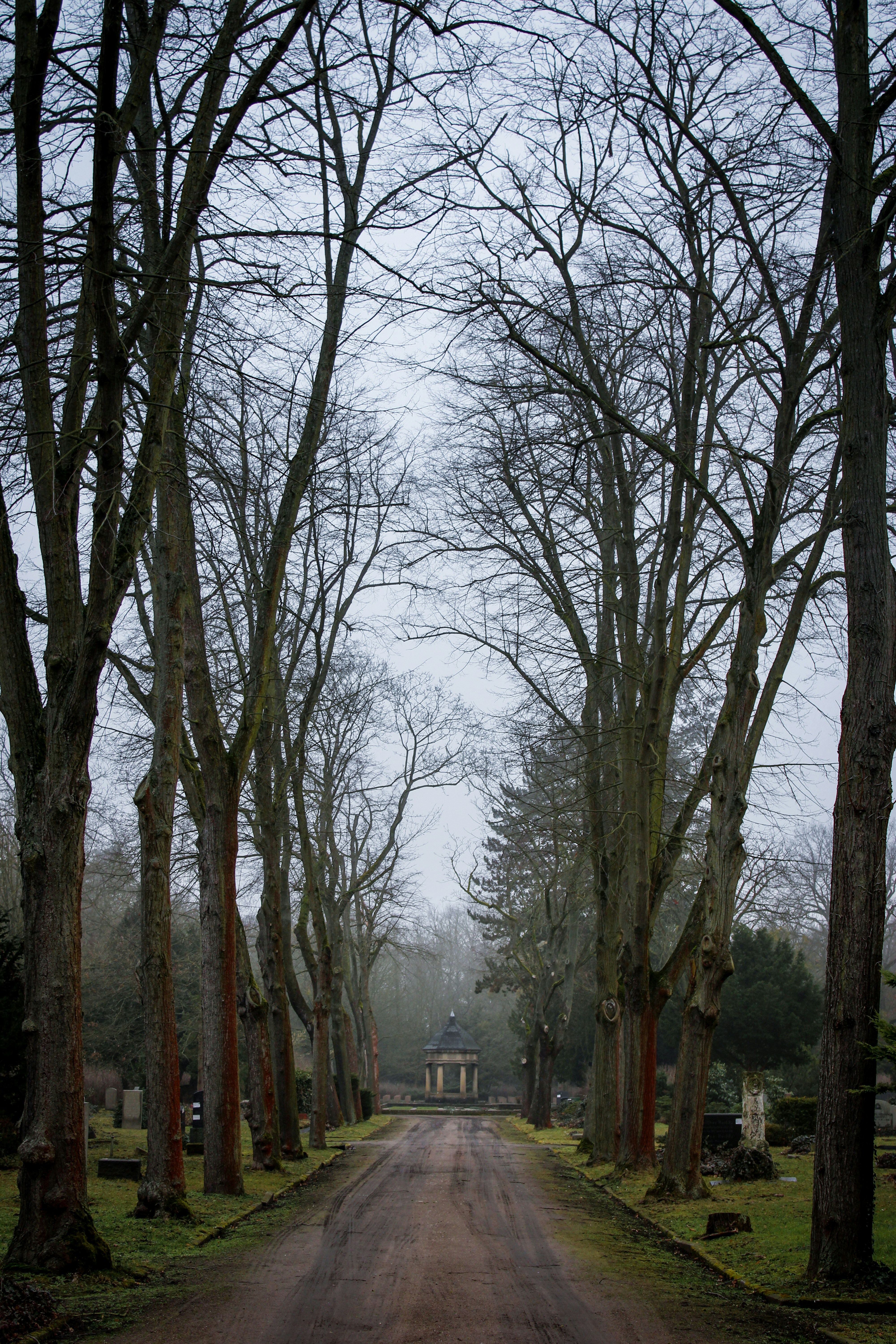 Bare trees line a dirt path leading to a monument. photo – Free Winter ...