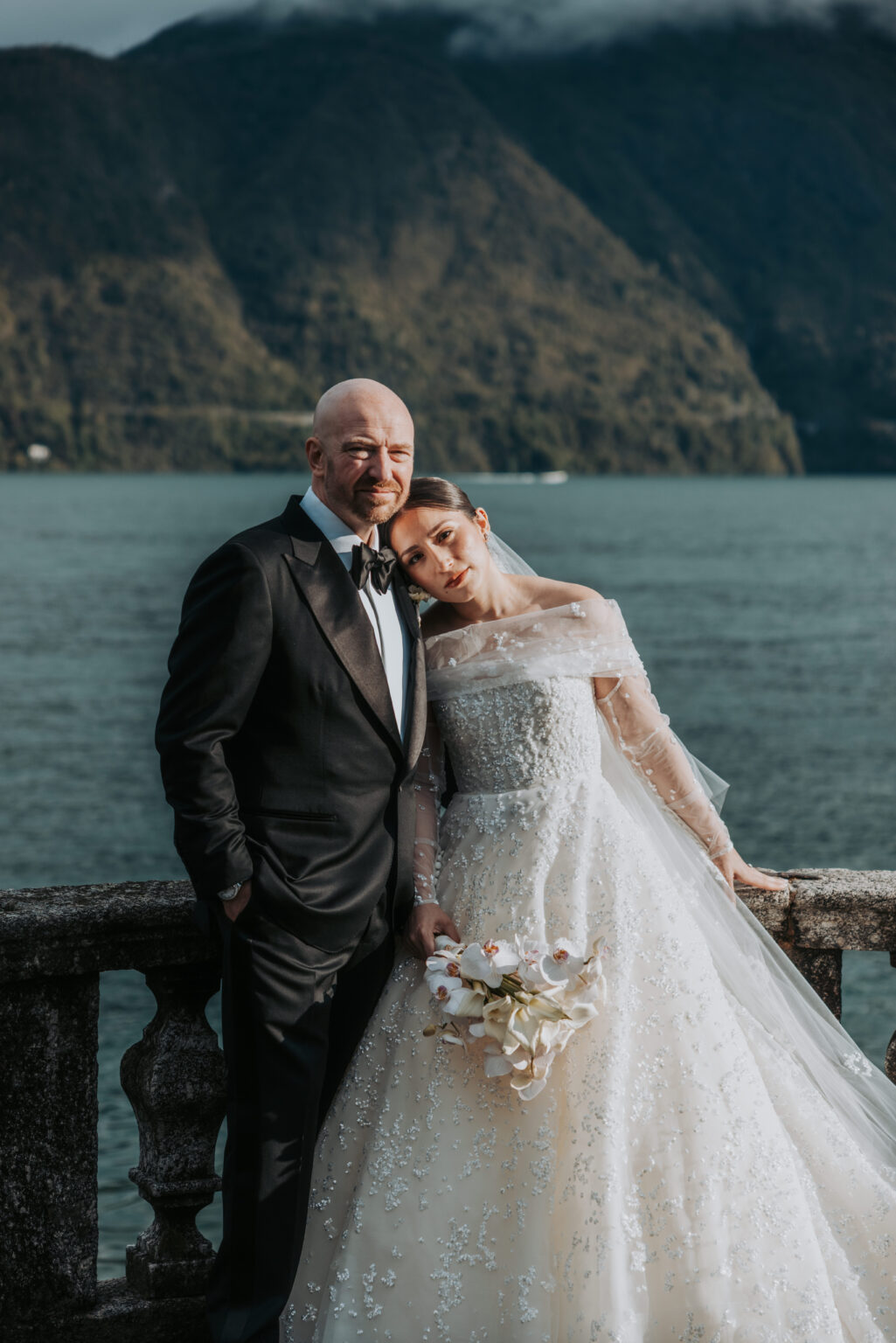 A bride in a white gown with a bouquet of flowers leans her head on the ...