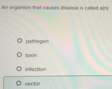 Solved: An organism that causes disease is called a(n) pathogen toxin ...