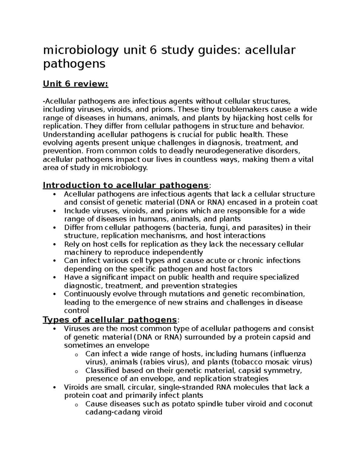 Microbiology Unit 6 Study Guide: Acellular Pathogens Overview - Studocu
