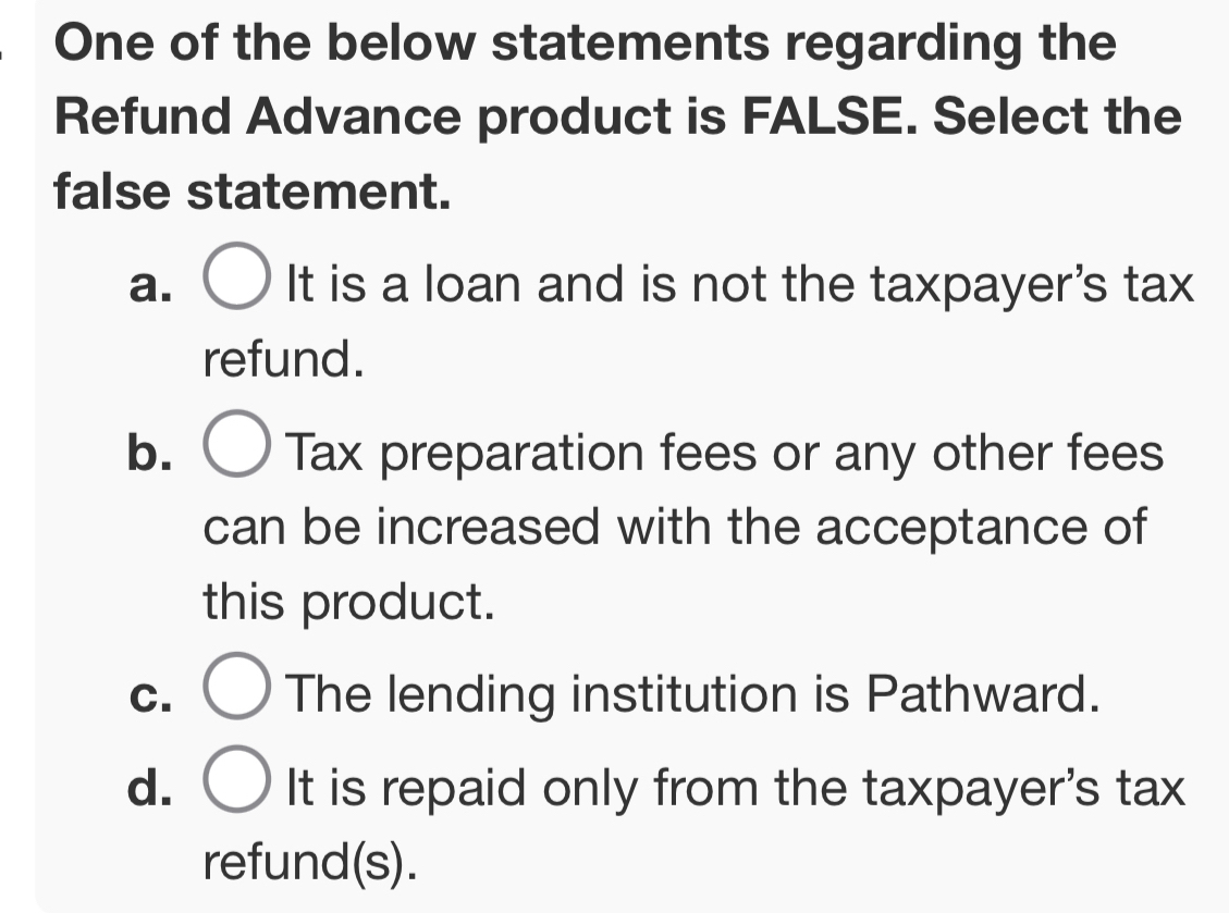 Solved: One of the below statements regarding the Refund Advance ...
