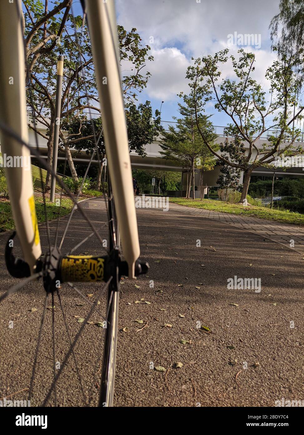 Bicycle wheel on a pathway Stock Photo - Alamy