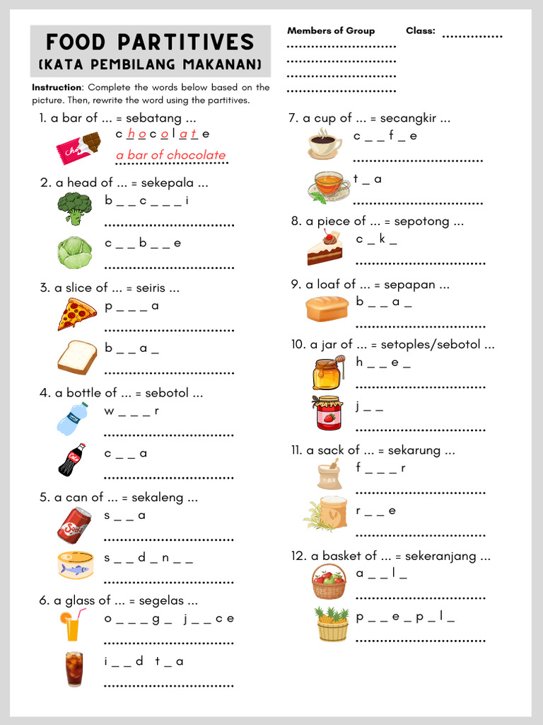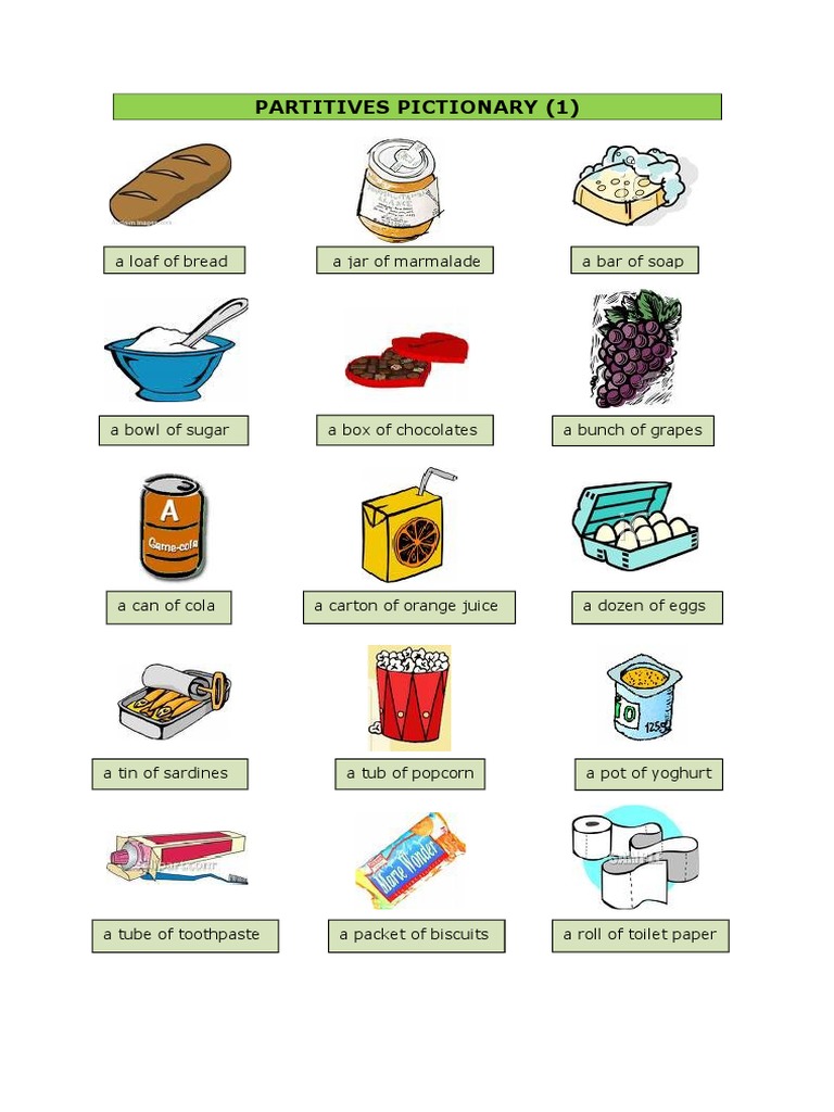 FOOD PARTITIVES - a box of, a bunch…: English ESL worksheets pdf & doc ...