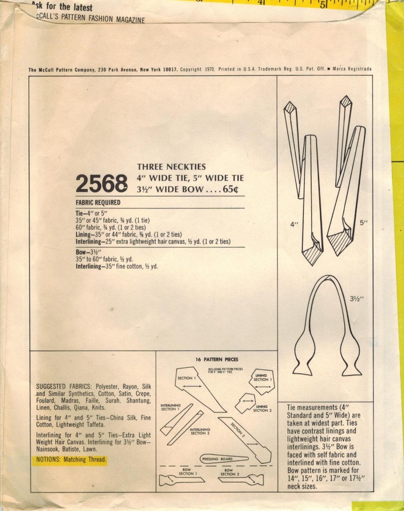 1970 McCalls Sewing Pattern 2568 Mens Neckties Bow Tie Accessories ...