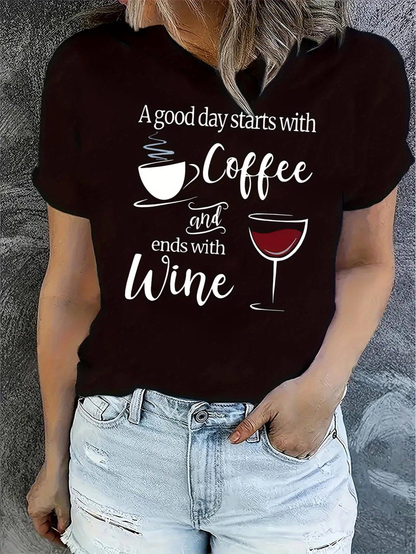 Casual Crew Neck T-Shirt for Women with 'Coffee and Glass' Graphic ...